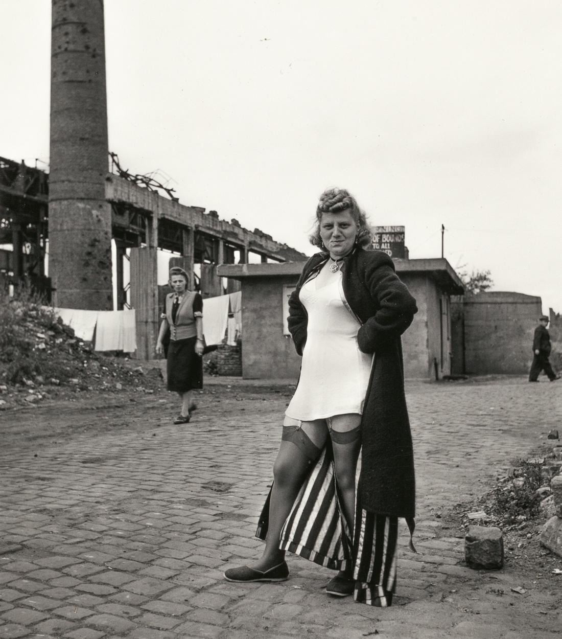 Prostitute near the partially destroyed Krupp factory, Essen 1947.