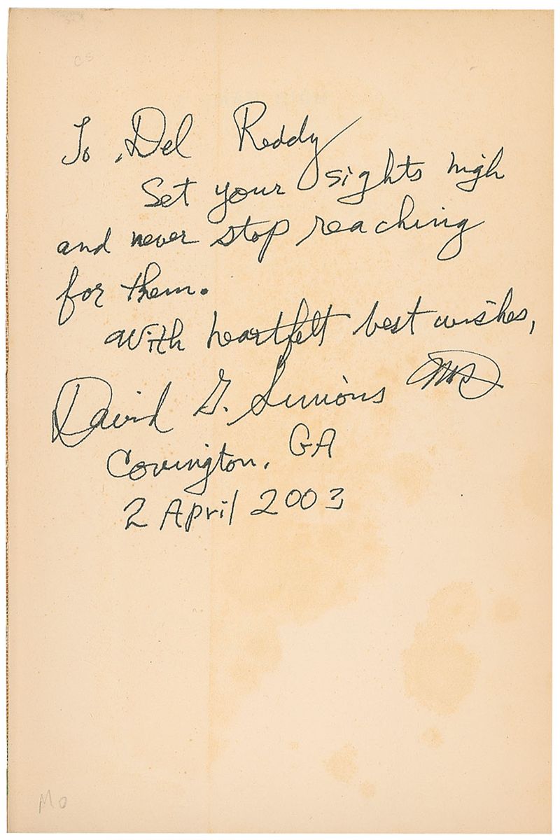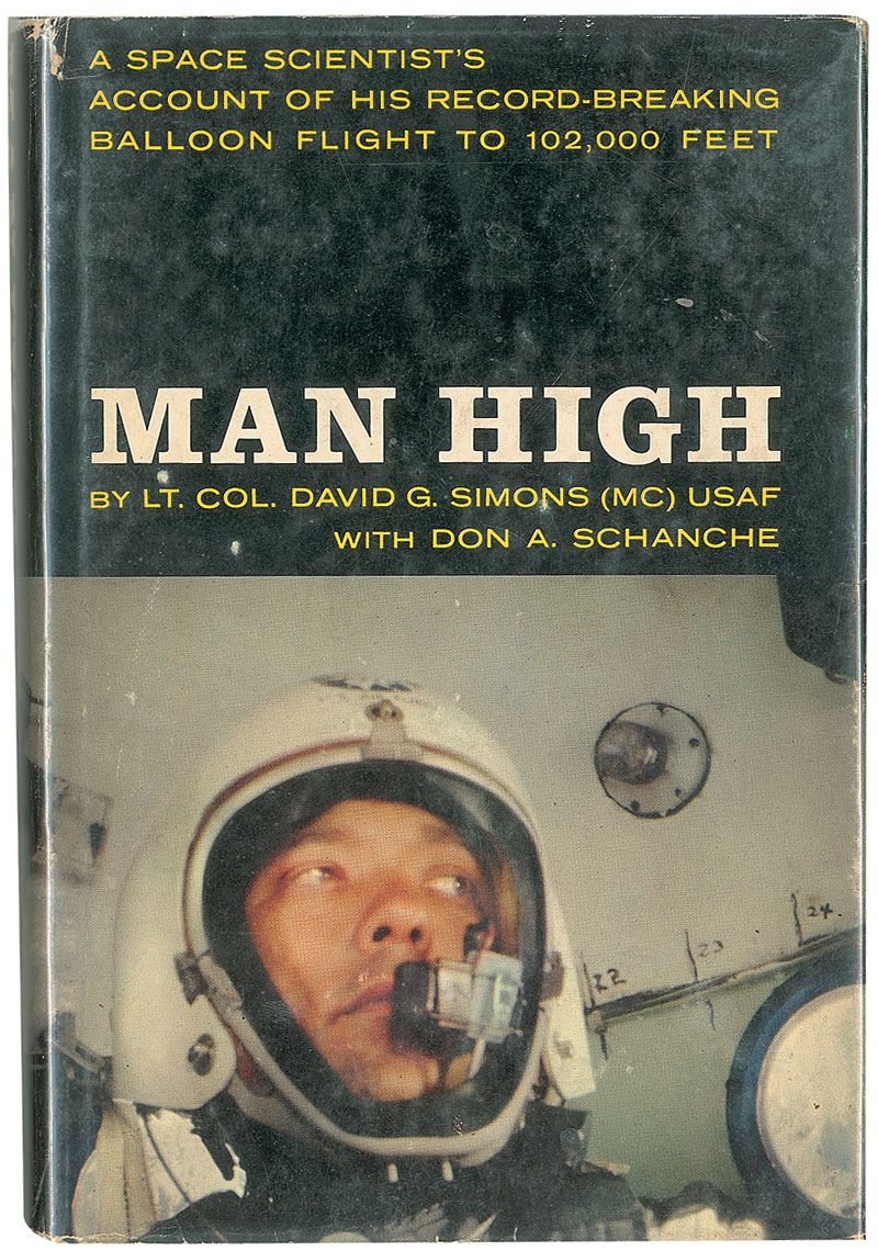 Participant in the 1950’s Project Manhigh as one of three men who piloted balloons to the upper reaches of the earth’s atmosphere. Simon’s 32-hour flight, the highest of the three, took him to an altitude of 101,516 feet, or more than 19 miles. Signed book: Man High. First edition. NY: Doubleday, 1960. Hardcover with dustjacket, 5.75 x 8.5, 262 pages. Signed and inscribed on the first free-end page, “To Del Reddy, Set your sights high and never stop reaching for them. With heartfelt best wishes, David G. Simons’s MC, Covington, GA, 2 April 2003.” In very good condition, with separated front hinge, scattered toning to signed page, light toning to closing pages and pastedowns, and scattered wear and creasing to dustjacket.