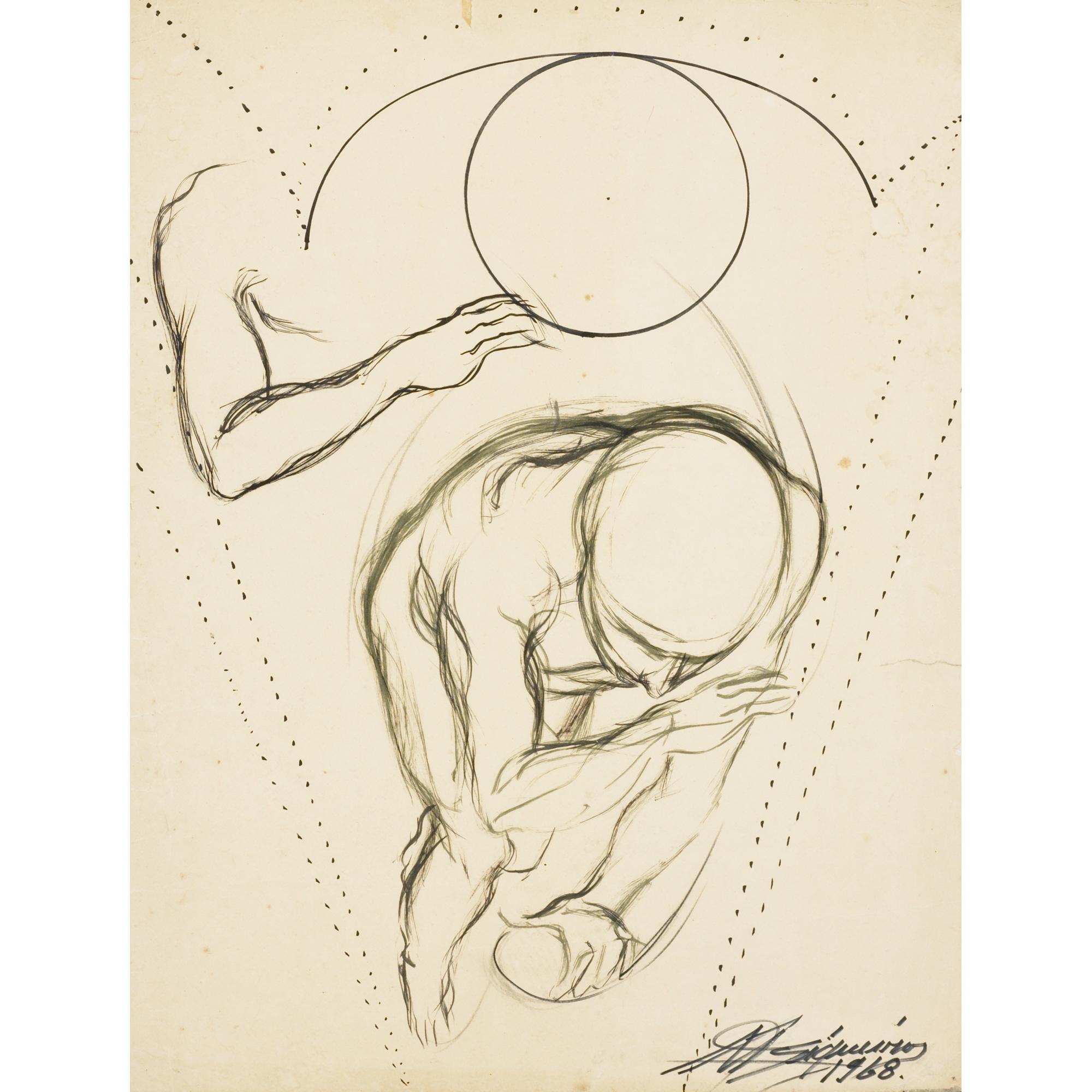 Signed and dated to lower right 'David Siqueiros 1968'. Inscribed, signed and dated to verso 'Projecto de Mural pana el poliforum cultural siqueiros 1968' 'David Siqueiros 1968'.