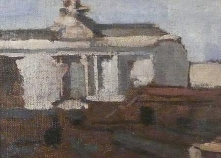 David Spivak (1893-1932) Oil on Board "Civic Center" Estate stamp verso 5" x 6 1/2"