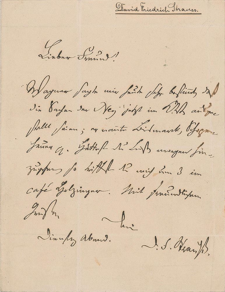 German liberal Protestant theologian and writer (1808–1874) who scandalized Christian Europe with his portrayal of the 'historical Jesus,' whose divine nature he denied. Untranslated ALS in German, signed “D. F. Strauss,” one page, 4.25 x 5.5, no date. In fine condition, with intersecting folds.