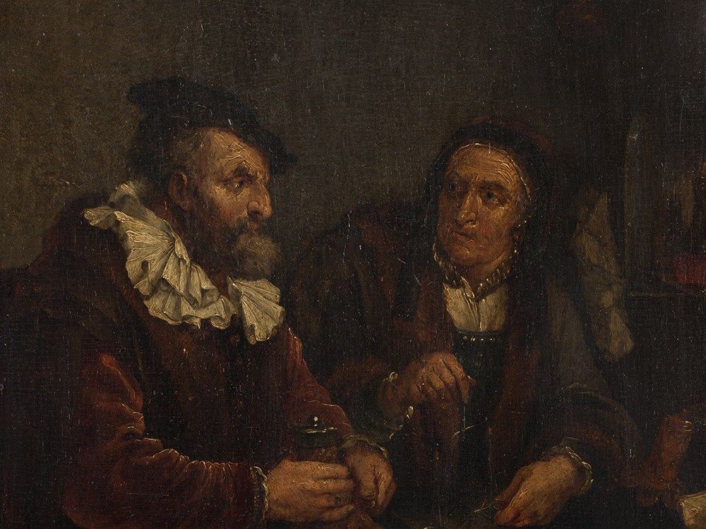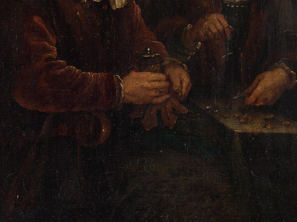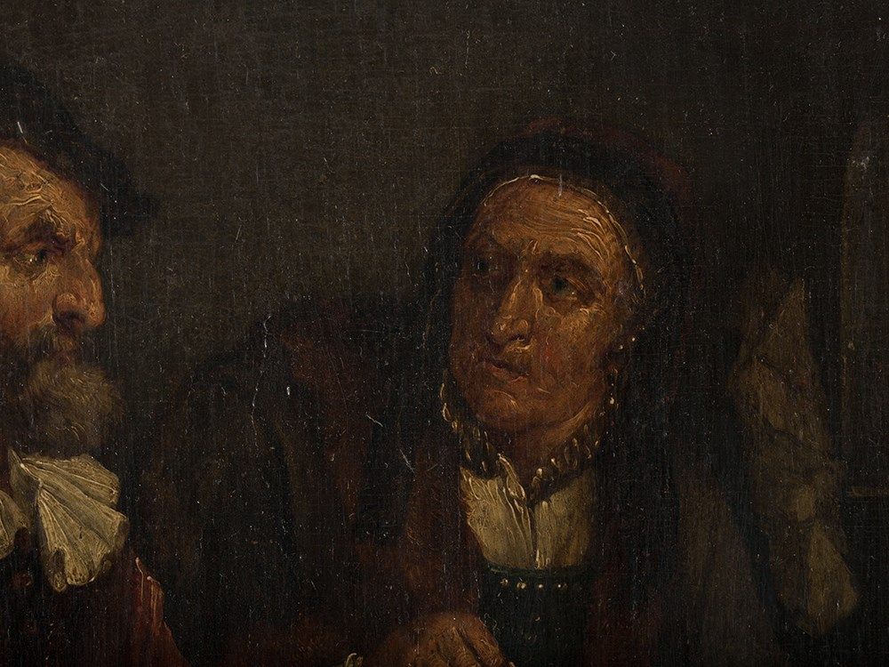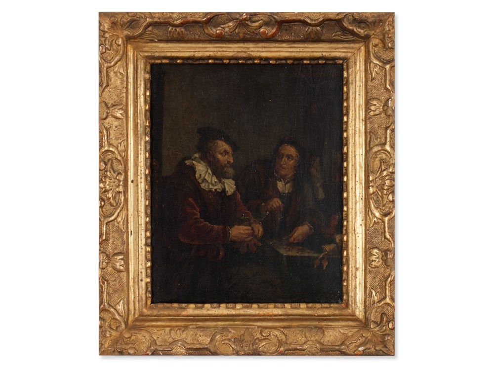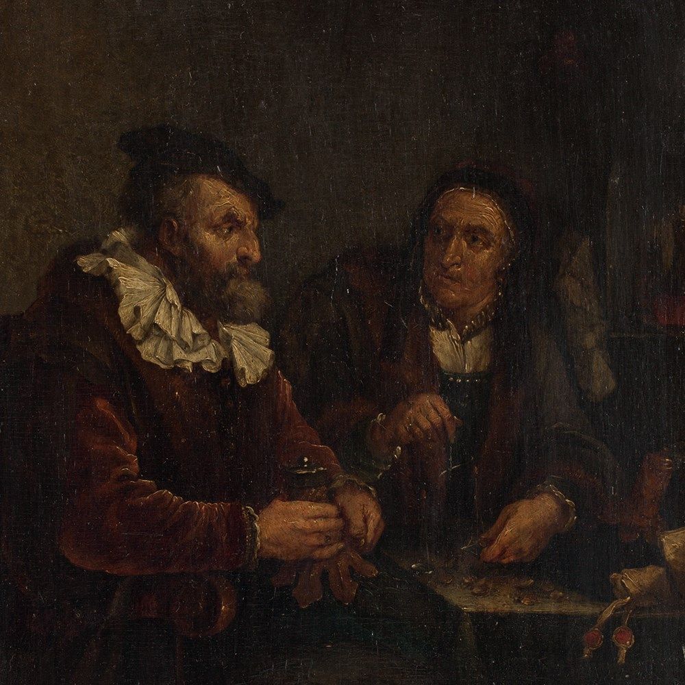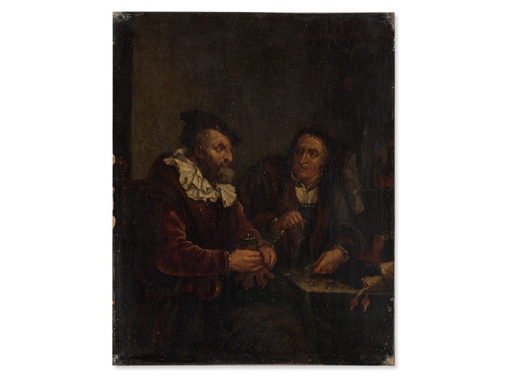 ‘The Gold-Weighers’ is a high-quality oil painting probably made by a German artist in the manner of David Teniers II (1610-1690) after the original by this artist, that is today in the possession of the National Gallery in London (Inv. No. 155). From this painting, there also exist engravings, for example by Frans van der Steen (c. 1625-1672). The genre scene shows an interior with a gold-weigher and her husband at the table. The subject of gold weighing was popular in the Dutch painting of the 16th and 17th century. The weighing and counting of gold symbolized the vice of avarice, one of the seven deadly sins. A French copper engraving of the 17th century also calls this occupation the last ‘Plaisir des Viellards’. The painting offers a very fine and expressive depiction of the characters, especially of the faces that come close to the quality of the great master Teniers.