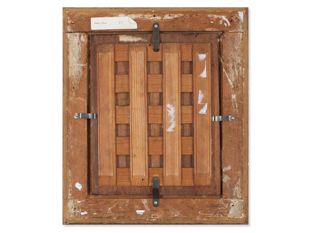 The painting was painted on wood panel, which later has been parquetted. It is in good condition, featuring normal wear. It shows a varnish, a patina of age, a slight crackle and some paint flaking at the edges. At the lower part are visible small touch-ups. The golden stucco frame has some blemishes. The overall dimensions with frame are 35.5 x 31 cm, and the wood panel measures 26 x 21 cm.