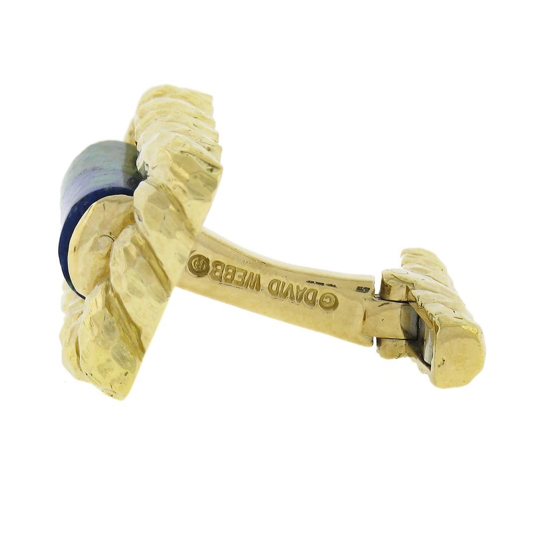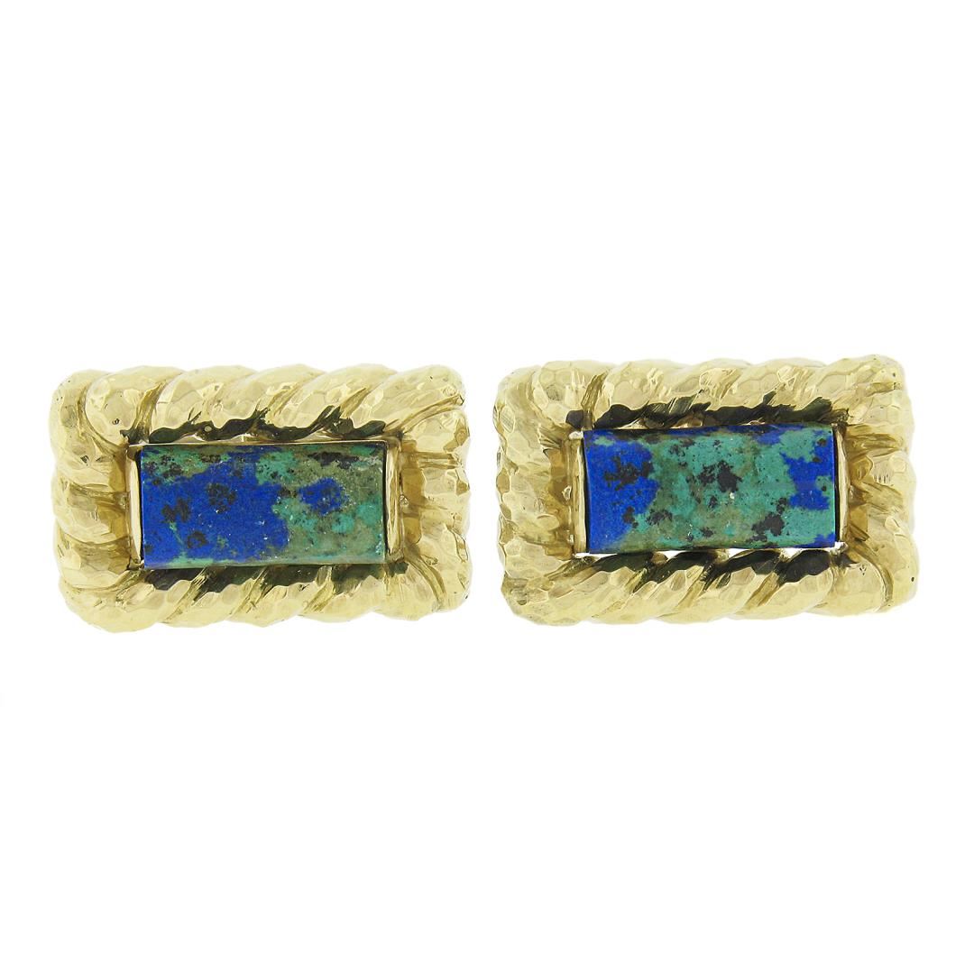 A solid 18k yellow gold cufflinks by David Webb, with 2 cylinder cut natural azumalachites (14x6.8mm). These cuff links have a swivel design with a clearance of 15.1mm, weigh a total of 26.58 grams, and the front panels measure 25x16mm.