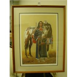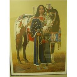 Limited Edition print (989/1200).  David Wright.  "The Princess" - 1985.  Depicts a Crow Indian maiden and her horse.  Colorfully adorned in typical dress.  Image - 22" x 16".  Overall - 30" x 24".  Signed in pencil on lower right.  Professionally framed.  Gray Stone Press, Pub.,  certificate included.  Condition:  Excellent