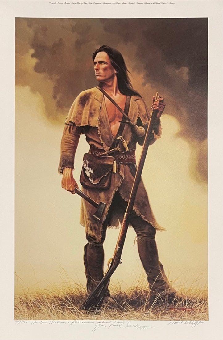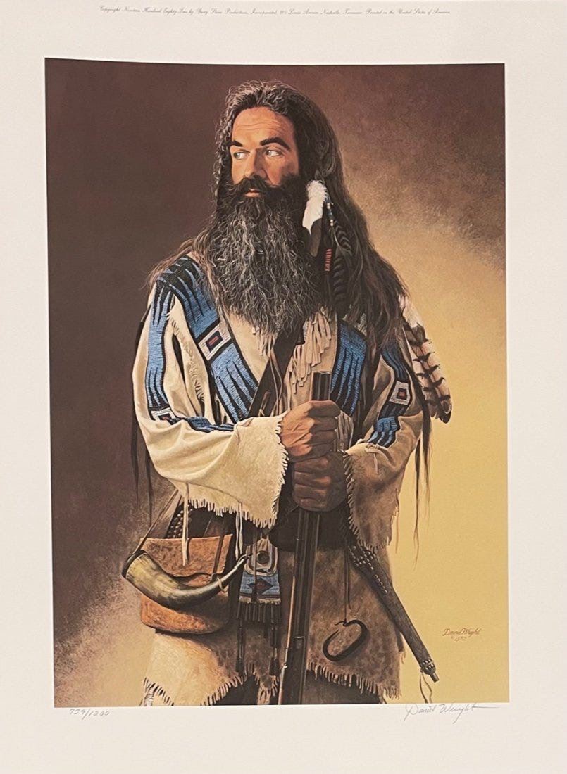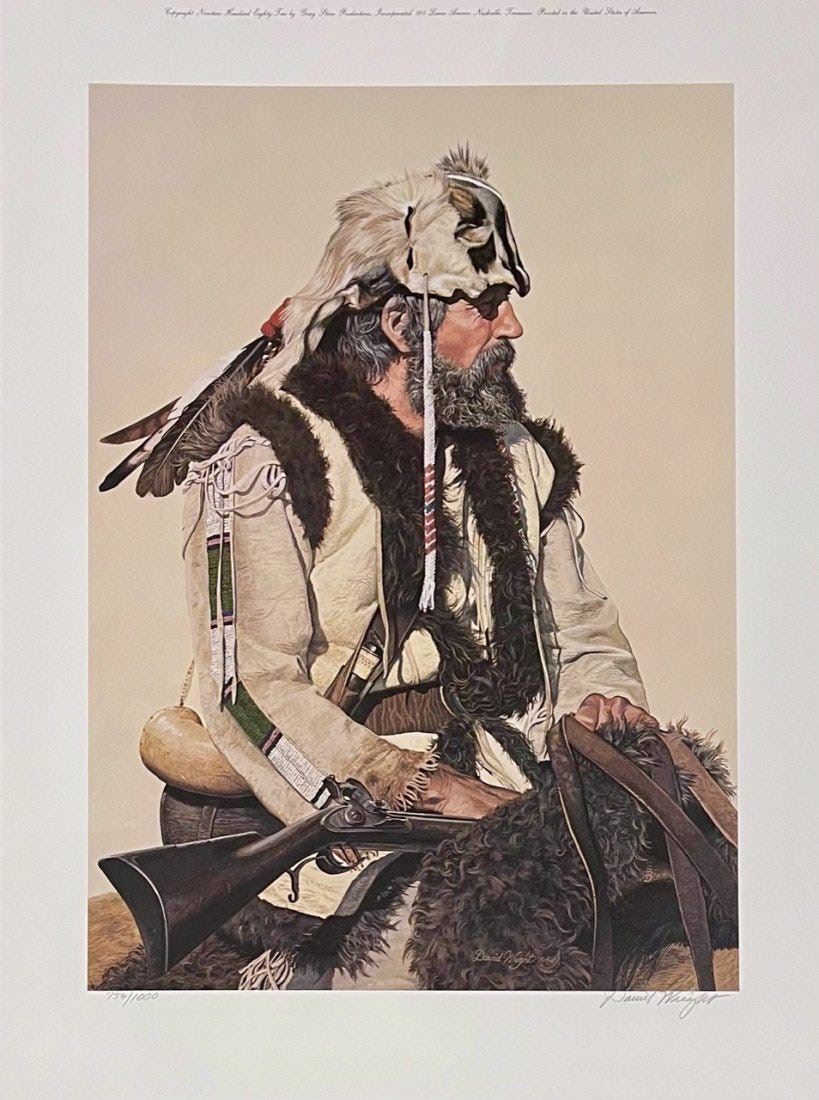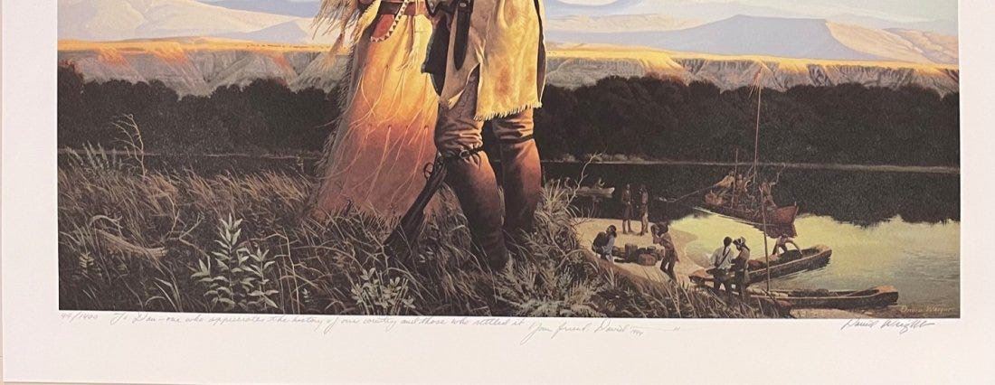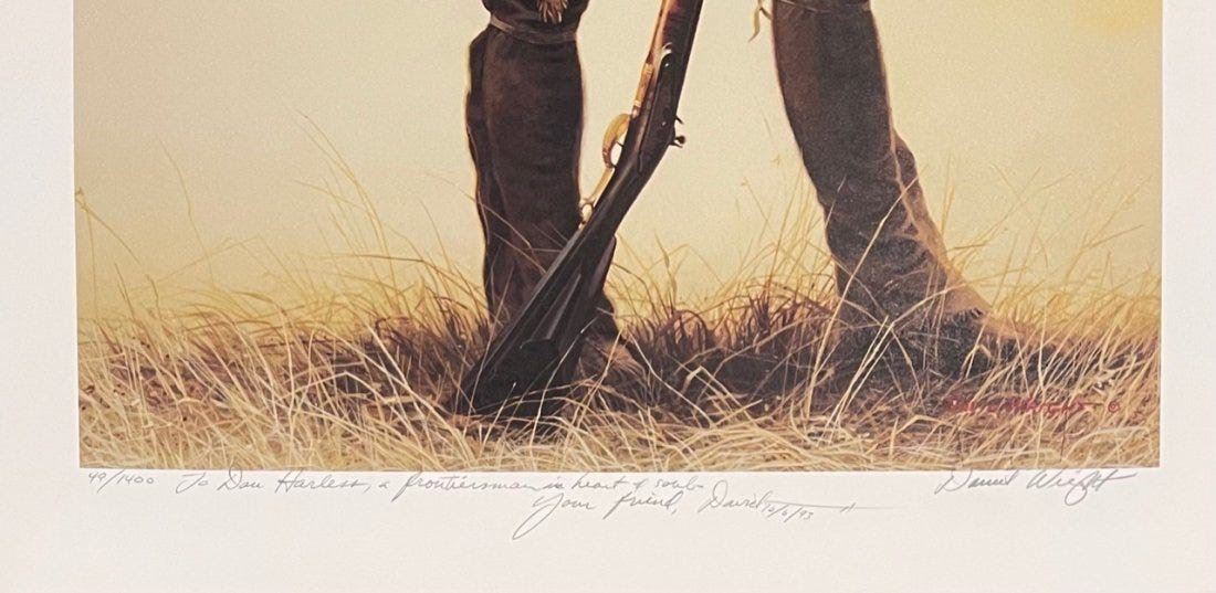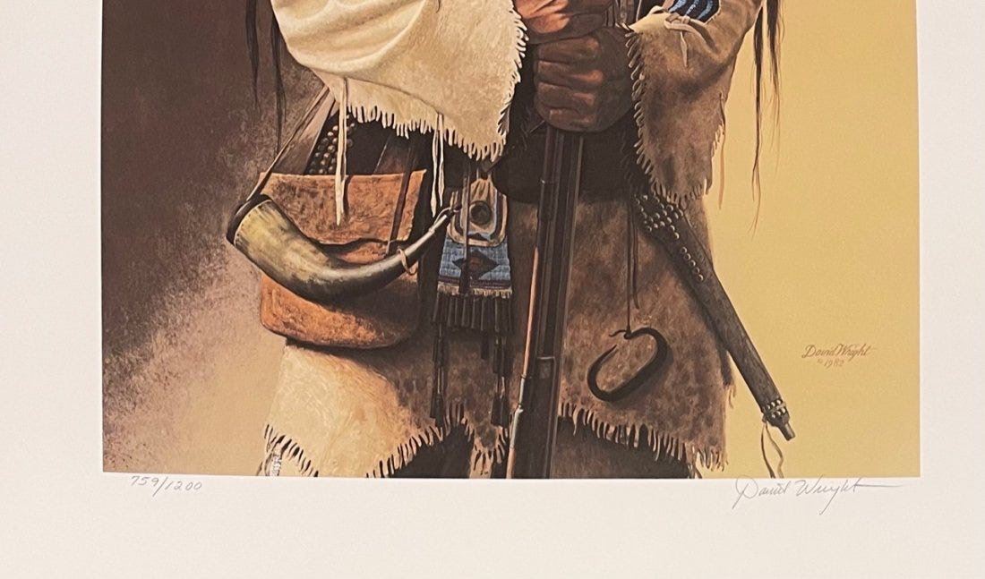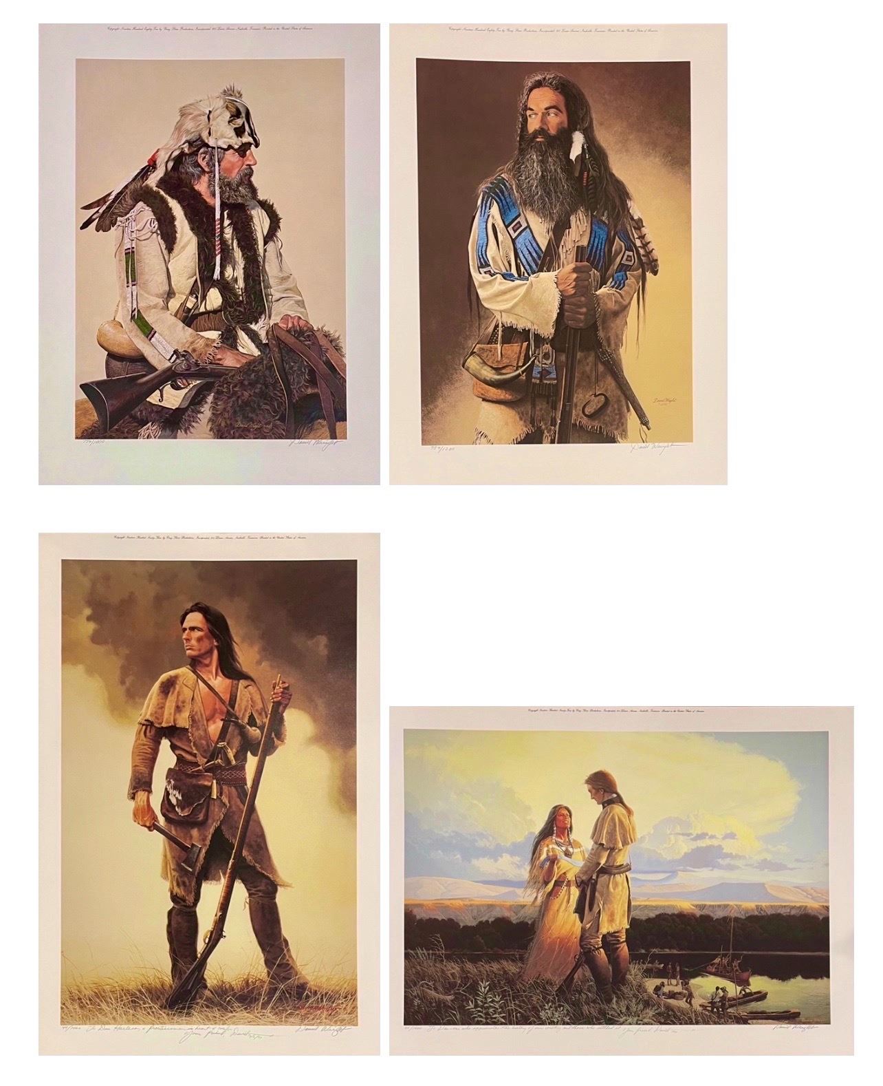 David Wright (American 1947-) Lot of 4 hand signed and numbered prints. 1) Golden Mountain Man" 759/1200. sheet 24.5” x18” 2) The Buckskinner" 754/1000 sheet 24.5" x 18" 3) "The Scout" 47/1400 sheet 28.5" x 19" 4) "The Blue Belt" 49/1400 sheet 28.5" x 19." Each in mint condition in the original folders with COAs.