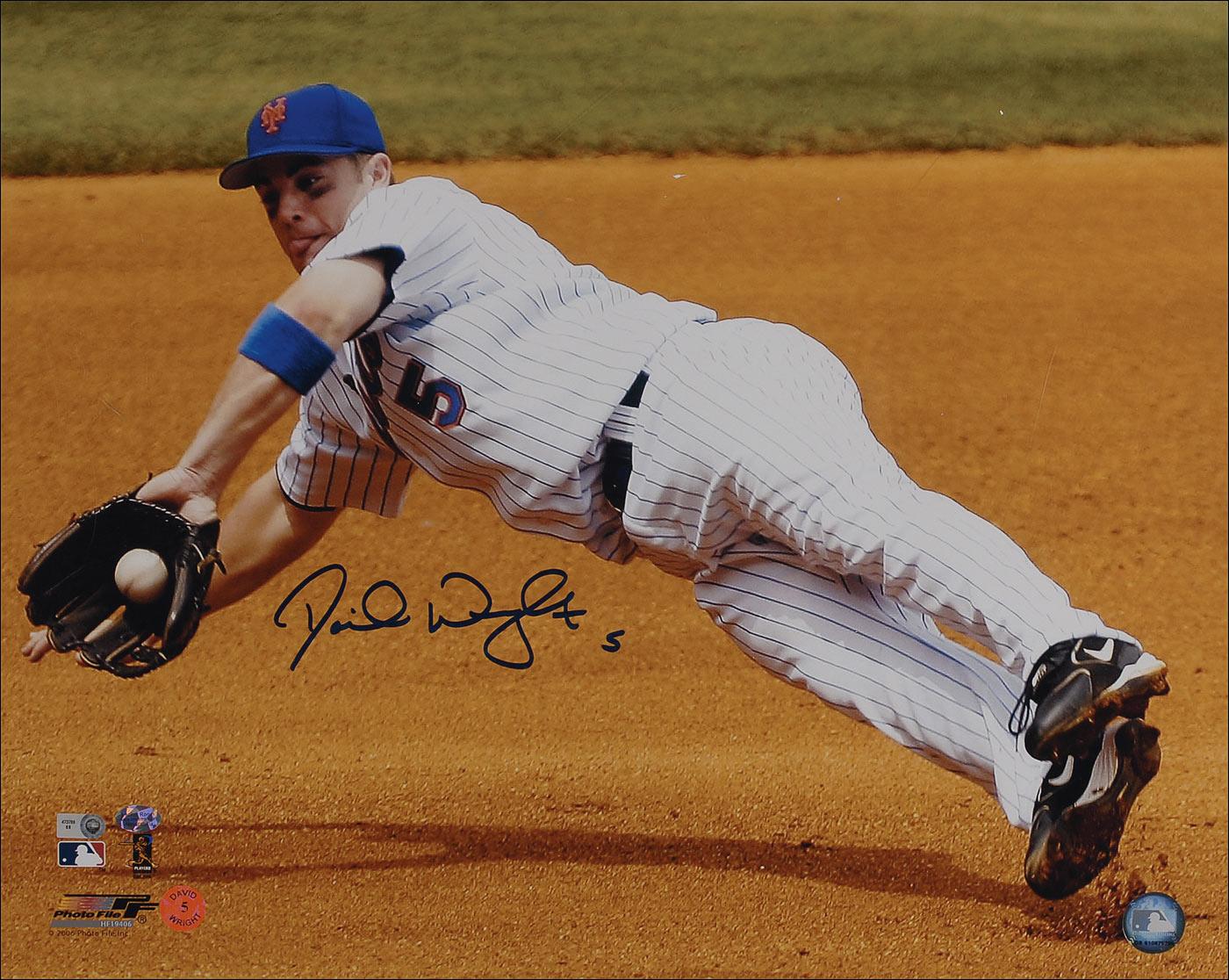 Color glossy 20 x 16 photo of Wright making a spectacular back-handed catch, signed in blue felt tip “David Wright 5.” In very fine condition with Wright’s authentication label and MLB hologram affixed to the photo.