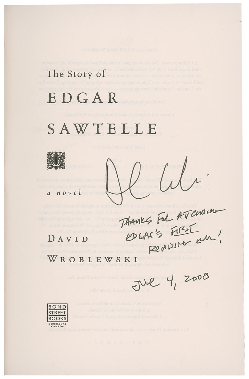 Signed book: The Story of Edgar Sawtelle. First edition, first printing. NY: Harper Collins, 2008. Hardcover with dustjacket, 6.5 x 9.25, 566 pages. Signed on the title page in black ink, “Dave Wroblewski, Thanks for attending Edgar’s first reading ever! June 4, 2008.” In fine condition.
