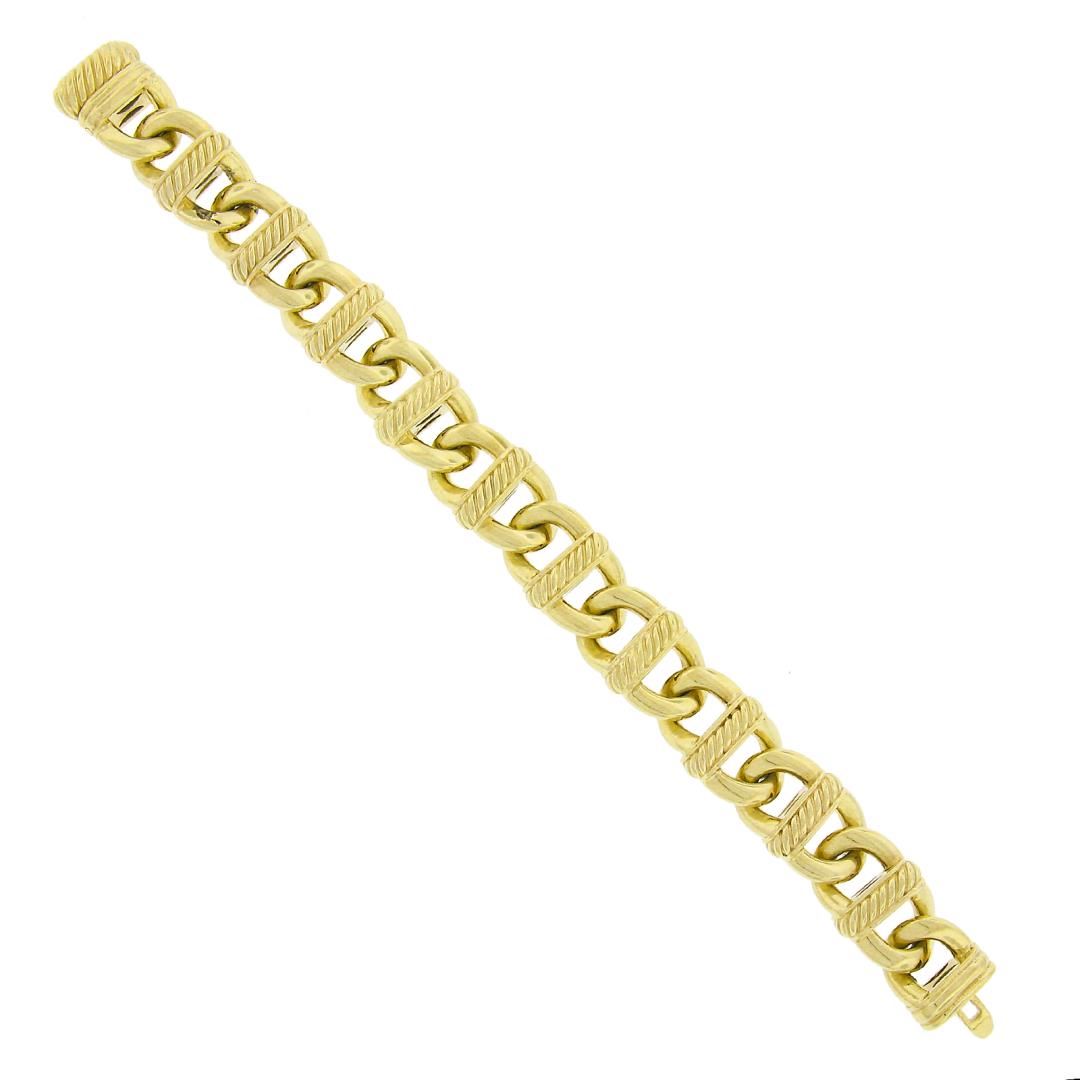 A solid 18k yellow gold link bracelet my David Yurman. It weighs a total of 55.83 grams, measures 14.4mm wide, and measures 6.5 inches in length.