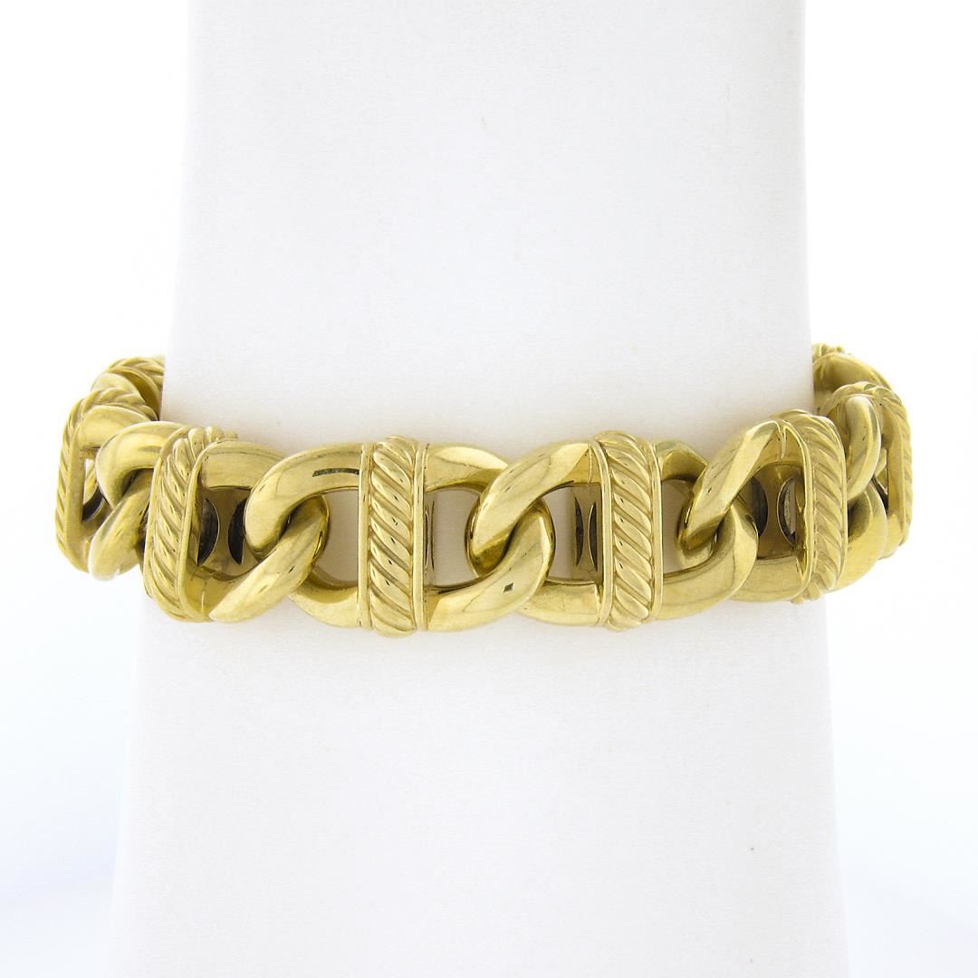 A solid 18k yellow gold link bracelet my David Yurman. It weighs a total of 55.83 grams, measures 14.4mm wide, and measures 6.5 inches in length.