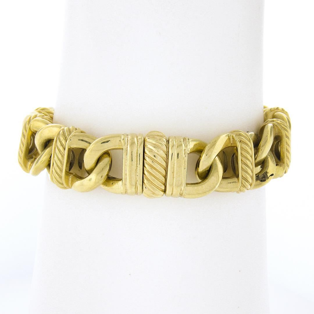 A solid 18k yellow gold link bracelet my David Yurman. It weighs a total of 55.83 grams, measures 14.4mm wide, and measures 6.5 inches in length.