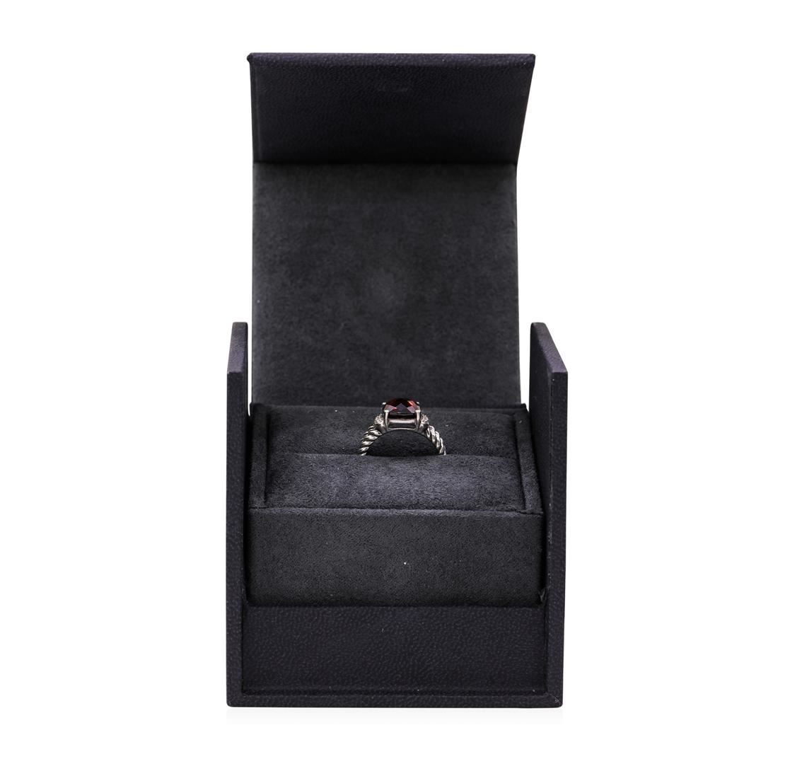 One David Yurman ring featuring: silver weighing 5.2 grams containing one rectangular checkerboard cut cushion shape garnet weighing 3.00ct and diamonds weighing 0.10ctw. The ring is a size 5.