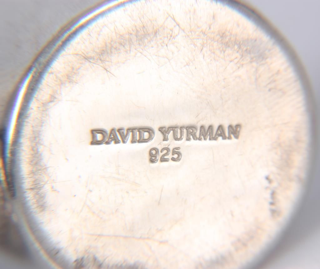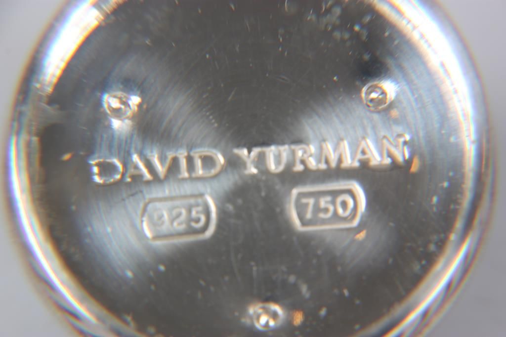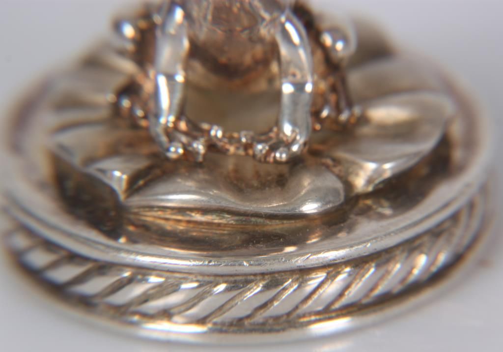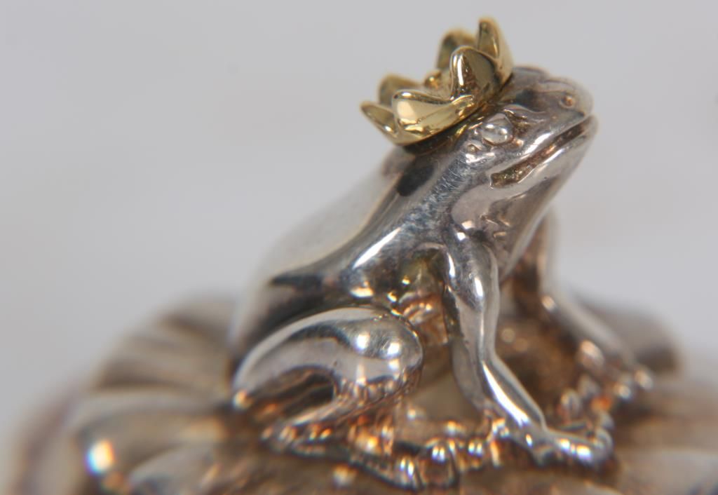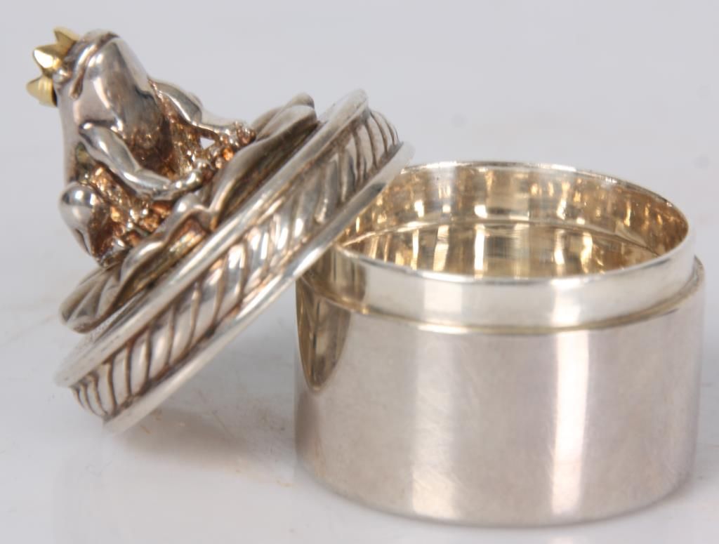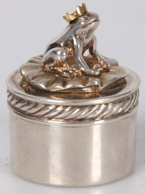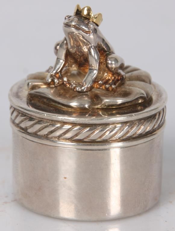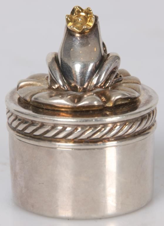 David Yurman Frog Prince Tooth Box. Cylindrical container has a figural frog seated on a lily pad and wearing a crown on the lid with a rope twisted border below, the container is sterling silver marked .925 and the crown is 18K yellow gold, marked .750 and signed David Yurman. In good condition with no breaks, damages or dings. 1.5 in. high x 1.25 in. dia. 1.72 oz.