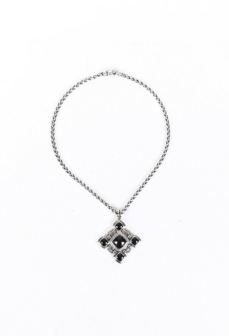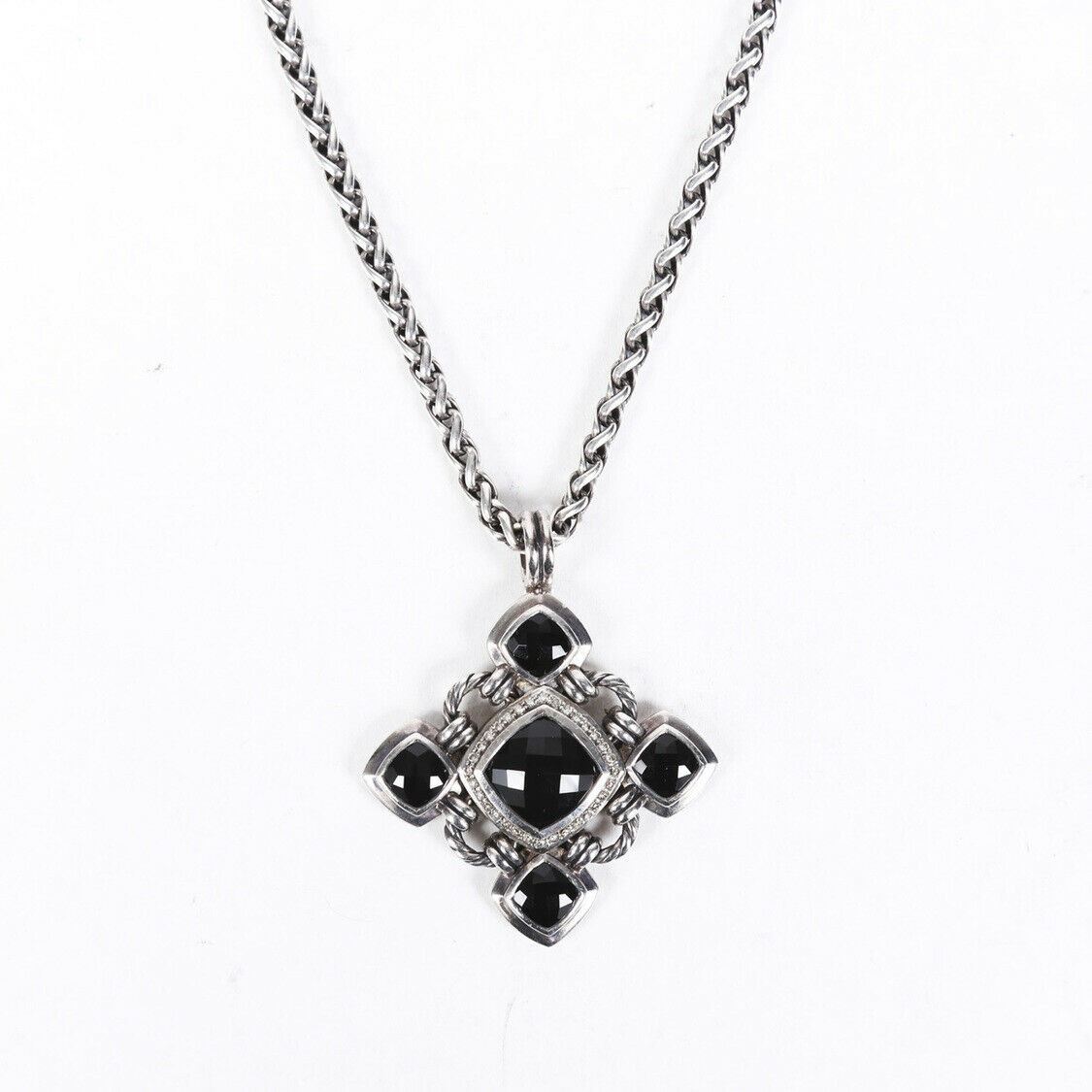David Yurman Renaissance sterling silver necklace features a pendant with onyx gemstones, diamond accents, and a lobster clasp fastening.