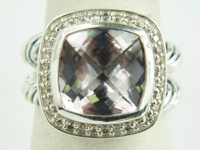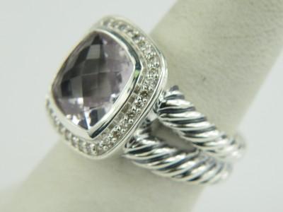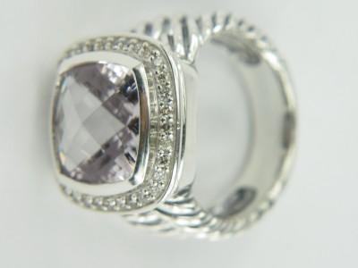 David Yurman Silver, Amethyst and Diamond Ring.The total ring's weight is 9.5 gramsThe total weight of the diamond is 0.32 cts approximately, H color VS clarity.The size of the Amethyst is 10 x 10 mm. The size of the ring is 5.25The measurement of the face of the ring is 16 x 16 mm. Thickness: 7 mm