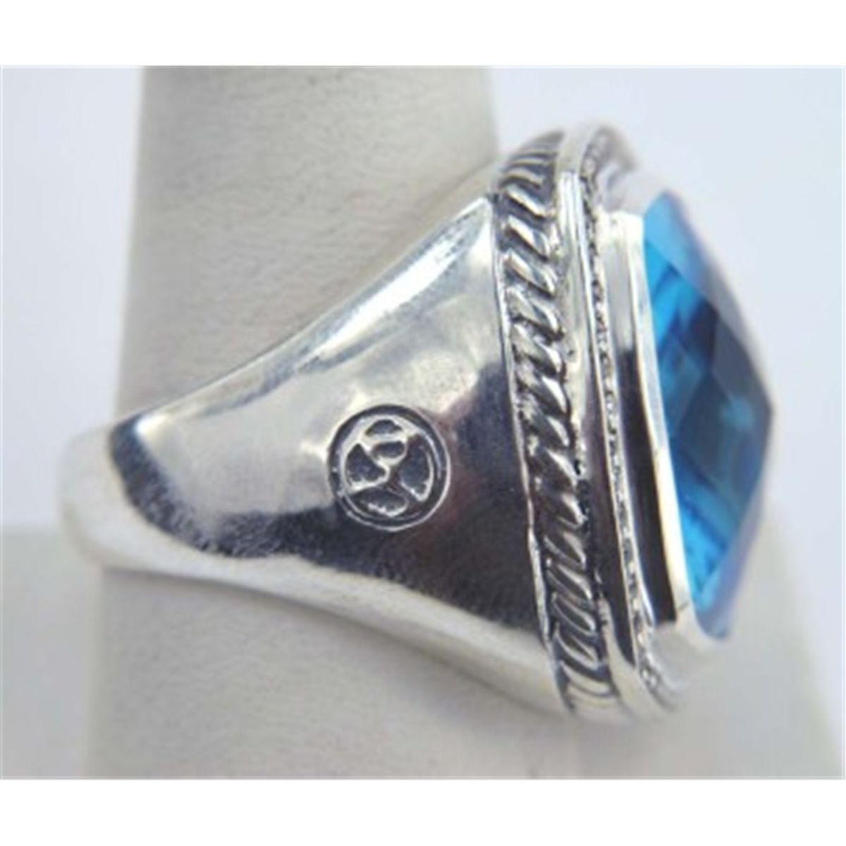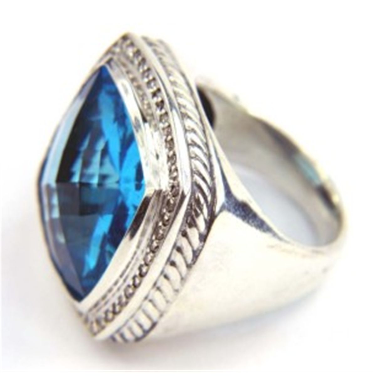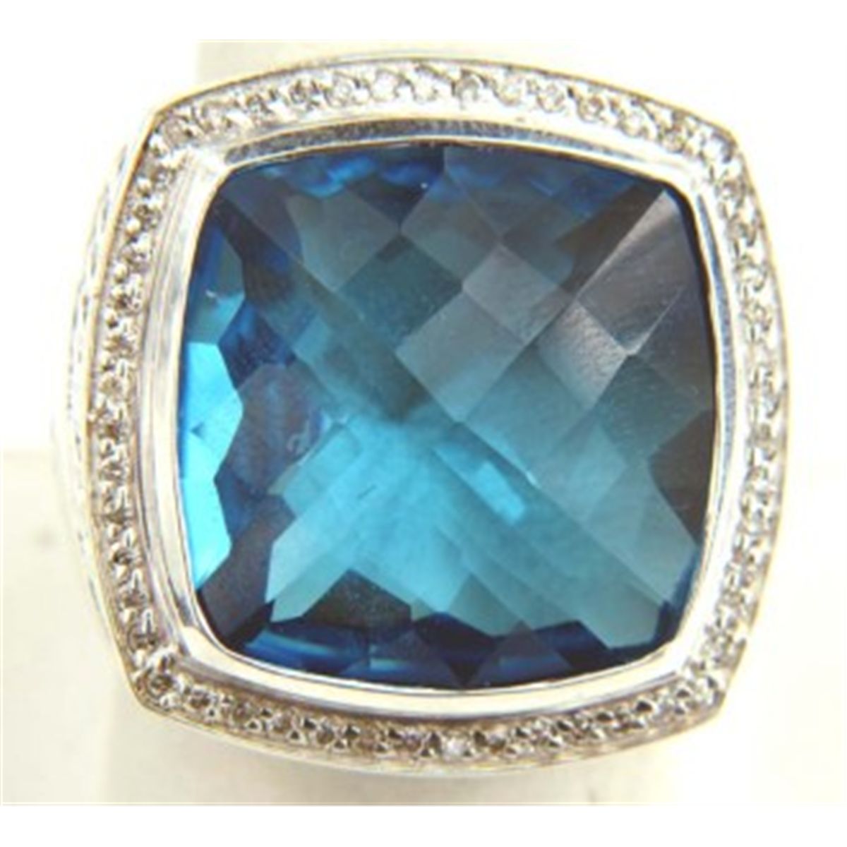 David Yurman Silver Blue Topaz Diamond ring.The total ring's weight is 23.6 grams.The size of the Blue Topaz is 21 x 21 mm.The size of the ring is 8.75