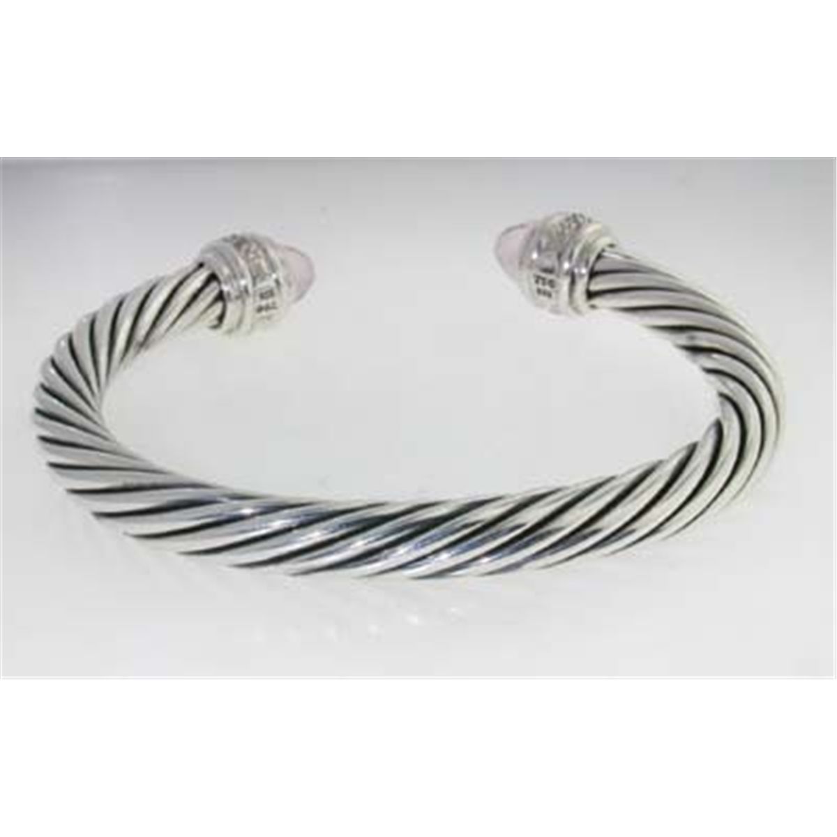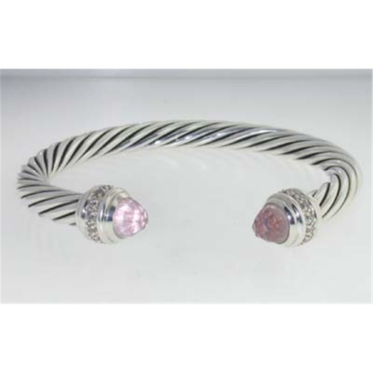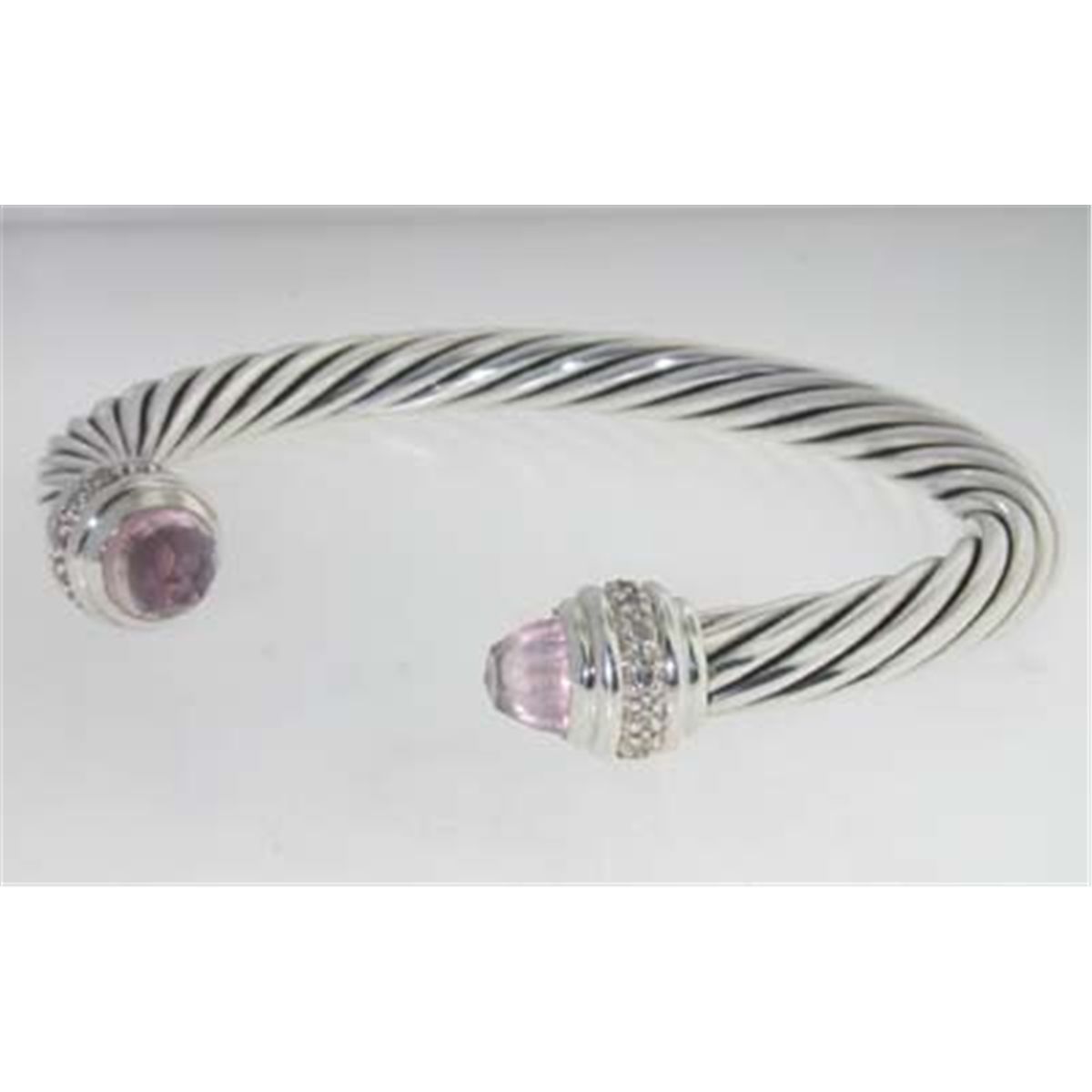 David Yurman Silver Pink Quartz & Diamond Bangle. The total Bangle's weight is 39.7 grams. The total diamond weight is 90 pts approxmiately, H-I color SI1 clarity. The size of Pink Quartz: 6 mm. The measurement of the inside bangle is 60 x 42 mm, Thickness: 6 mm.