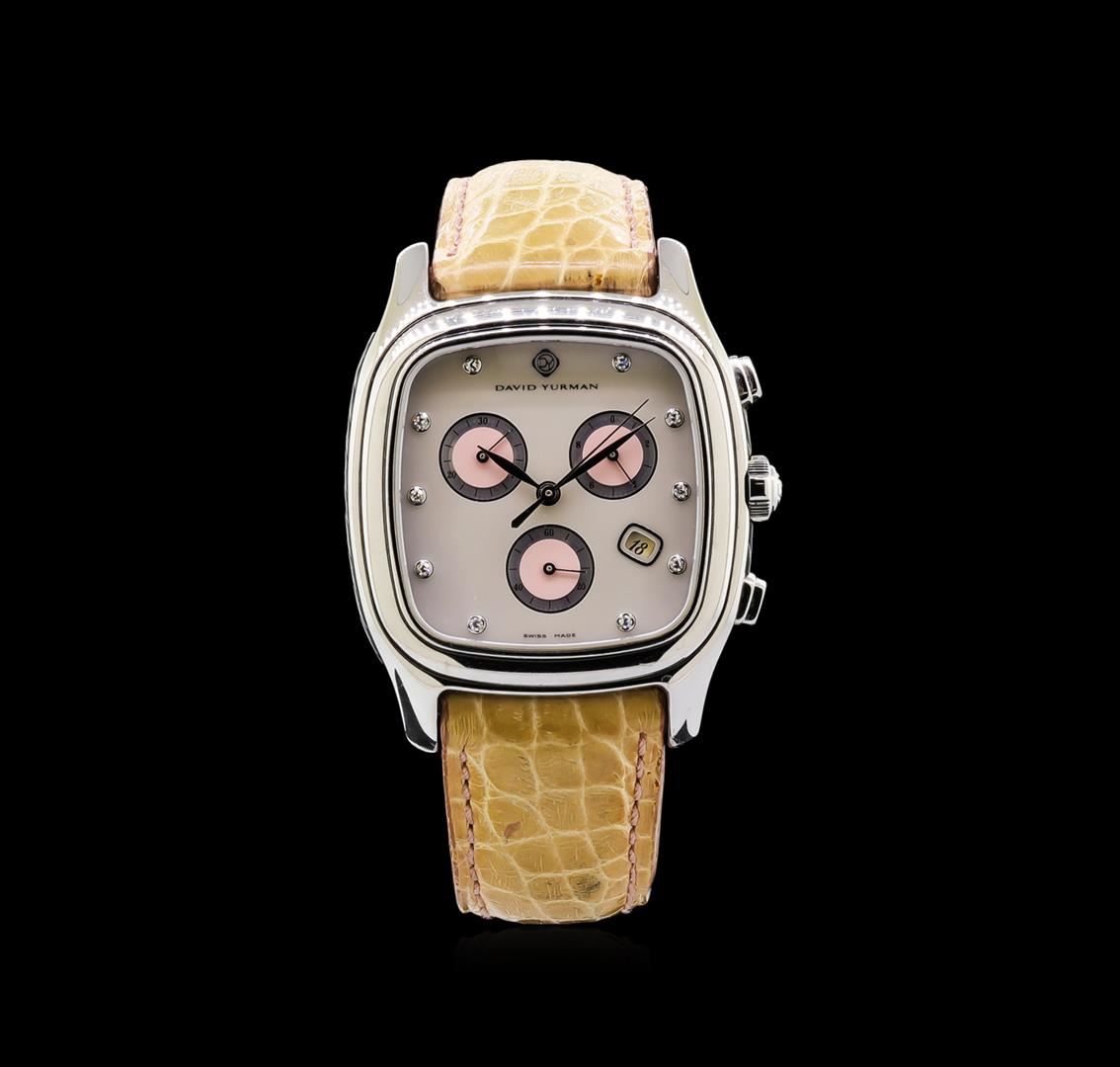 One, David Yurman Thoroughbred Chronograph wristwatch electronically tested, Stainless Steel Case: 45 x 36mm, Case Back: engraved with the manufacturers name, logo, ID numbers and information, Case Sides: David Yurman signature stainless steel twisted cable inlay, Bezel: polished, Logo'd Crown, Crystal: synthetic sapphire. Swiss Movement: quartz, Dial: mother of pearl, pointed hands, & diamond markers, Chronograph Functions: Silver rimmed Pink sub dials for; hours, minutes, and seconds, Date Window: 4 o'clock position, Bracelet: saddle stitched leather strap, Condition: G-6 Extra Fine. Seven and one half inch length, adjustable, with a David Yurman buckle. Total Weight of Watch 154.01gm. AIG Appraised at $2,880.00.