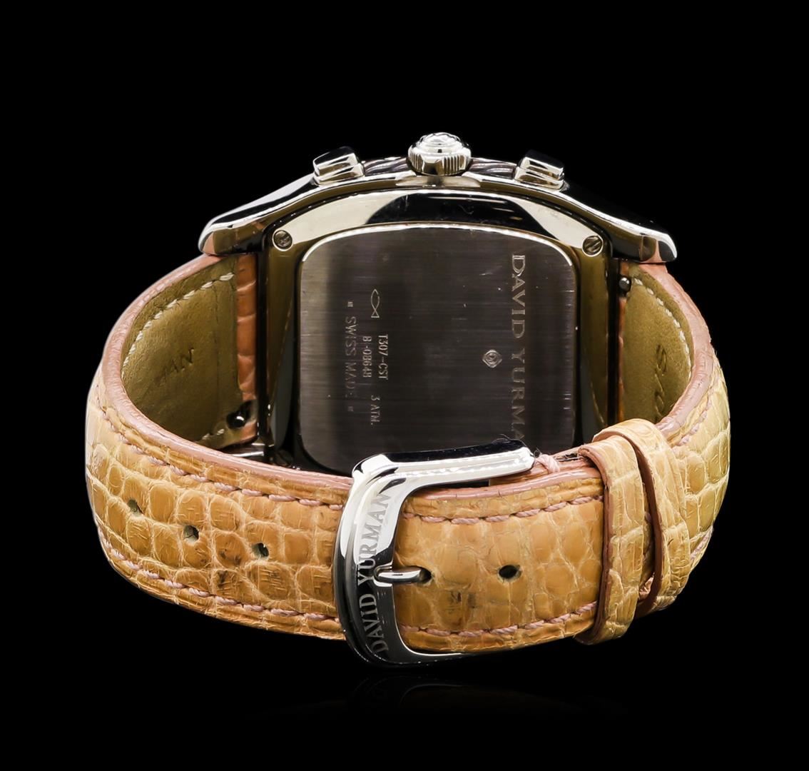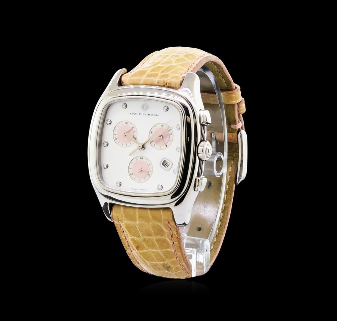 One, David Yurman Thoroughbred Chronograph wristwatch electronically tested, Stainless Steel Case: 45 x 36mm, Case Back: engraved with the manufacturers name, logo, ID numbers and information, Case Sides: David Yurman signature stainless steel twisted cable inlay, Bezel: polished, Logo'd Crown, Crystal: synthetic sapphire. Swiss Movement: quartz, Dial: mother of pearl, pointed hands, & diamond markers, Chronograph Functions: Silver rimmed Pink sub dials for; hours, minutes, and seconds, Date Window: 4 o'clock position, Bracelet: saddle stitched leather strap, Condition: G-6 Extra Fine. Seven and one half inch length, adjustable, with a David Yurman buckle. Total Weight of Watch 154.01gm. AIG Appraised at $2,880.00.
