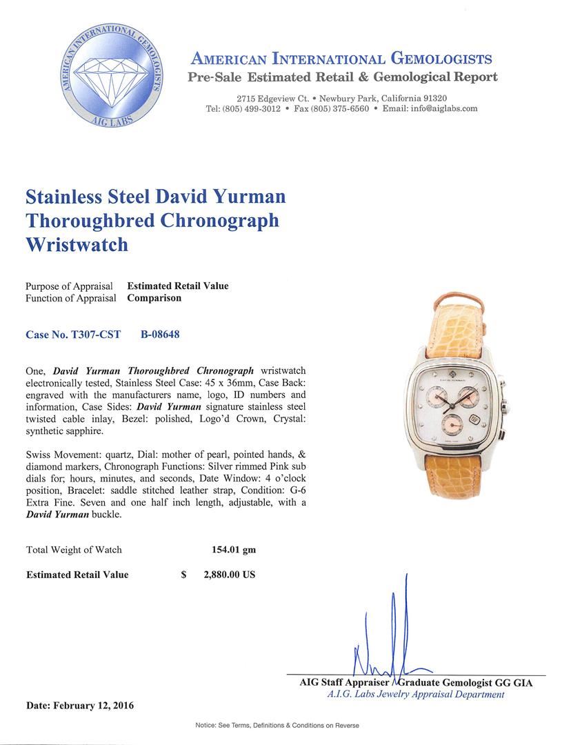 One, David Yurman Thoroughbred Chronograph wristwatch electronically tested, Stainless Steel Case: 45 x 36mm, Case Back: engraved with the manufacturers name, logo, ID numbers and information, Case Sides: David Yurman signature stainless steel twisted cable inlay, Bezel: polished, Logo'd Crown, Crystal: synthetic sapphire. Swiss Movement: quartz, Dial: mother of pearl, pointed hands, & diamond markers, Chronograph Functions: Silver rimmed Pink sub dials for; hours, minutes, and seconds, Date Window: 4 o'clock position, Bracelet: saddle stitched leather strap, Condition: G-6 Extra Fine. Seven and one half inch length, adjustable, with a David Yurman buckle. Total Weight of Watch 154.01gm. AIG Appraised at $2,880.00.