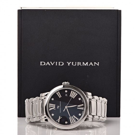 Watch is crafted of stainless steel and features a round 38mm case with a black mother of pearl dial, bold silver Roman numeral and diamond hour markers, a date window, and Swiss quartz movement.