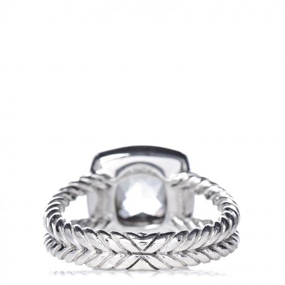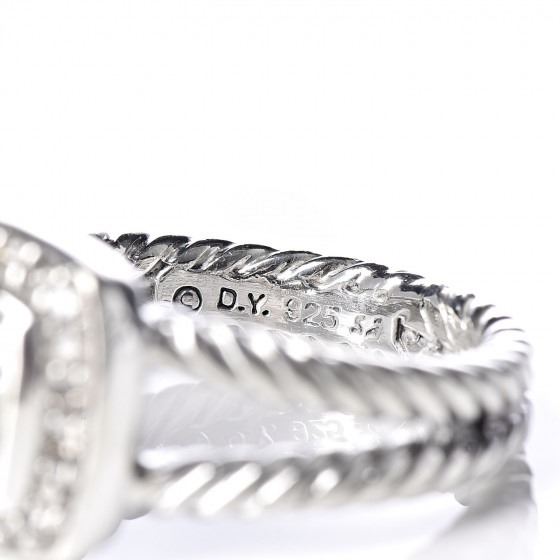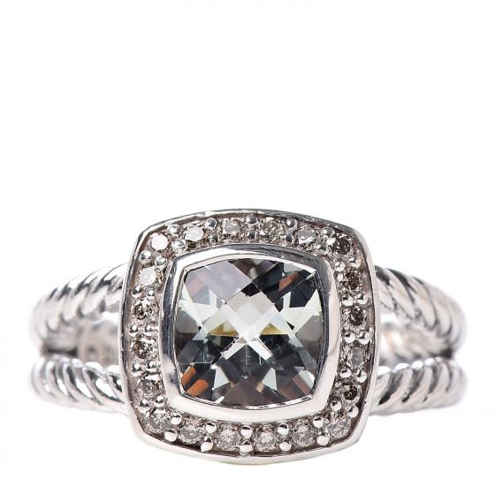 This ring is crafted of sterling silver and features a cable-style band with a faceted 7mm prasiolite stone framed by pave diamonds, approximately .17 total carat weight.