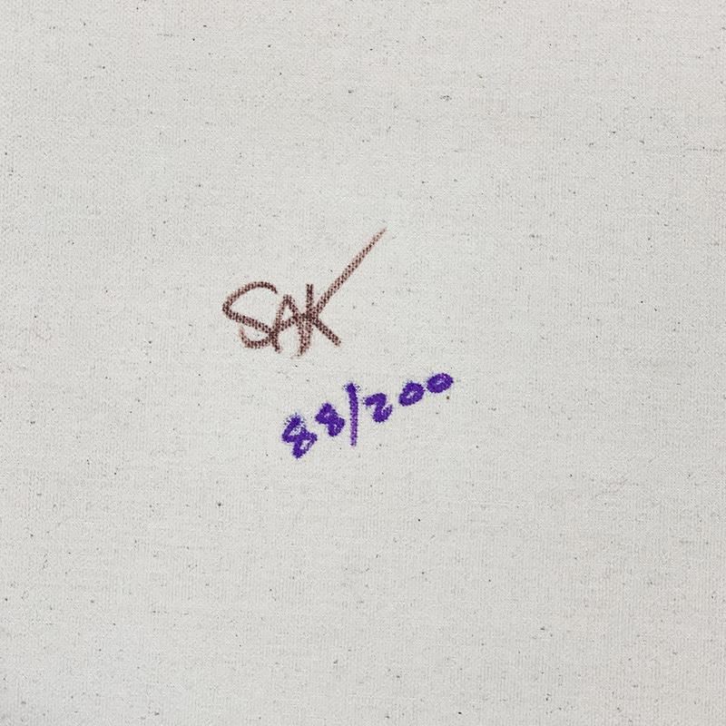 "David and Goliath Gold" is a limited edition hand pulled silkscreen mixed media on canvas by Andy Warhol protege Steve Kaufman (1960-2010). This piece is numbered and 88/200 and hand signed inverso. Includes letter of authenticity. As is common with Kauf