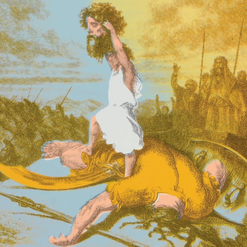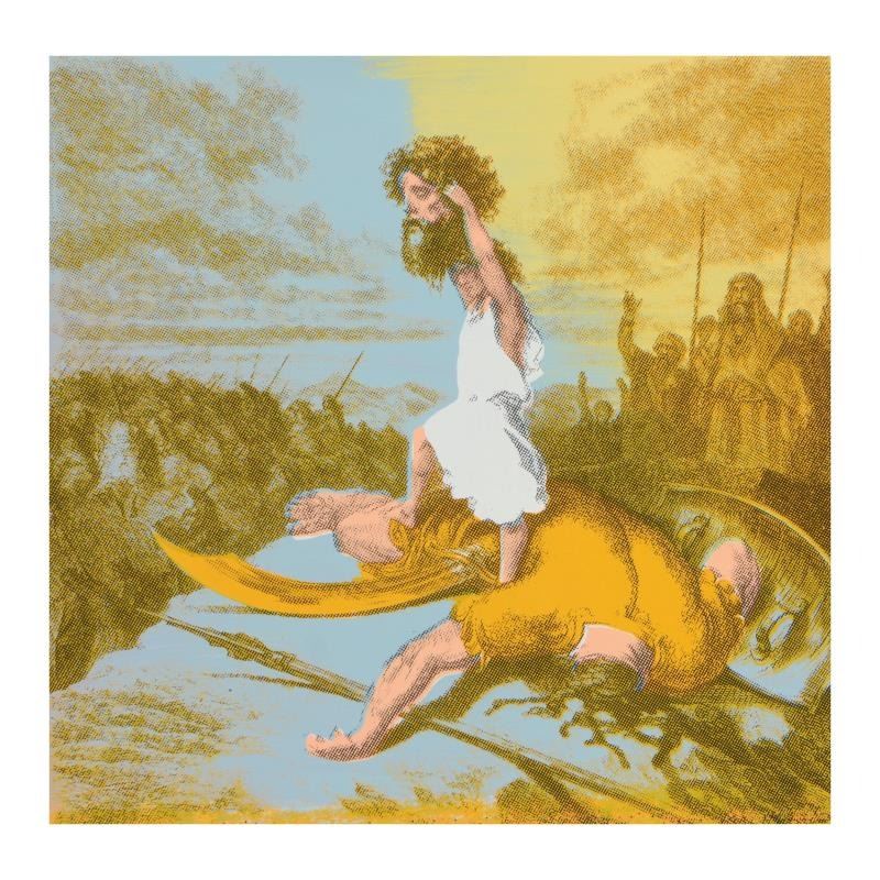 "David and Goliath" is a hand painted limited edition silkscreen on canvas by Andy Warhol protege Steve Kaufman (1960-2010). This piece is AP numbered 6/50 and hand signed inverso. Includes Certificate of Authenticity. Measures approx. 14" x 14" (image).
