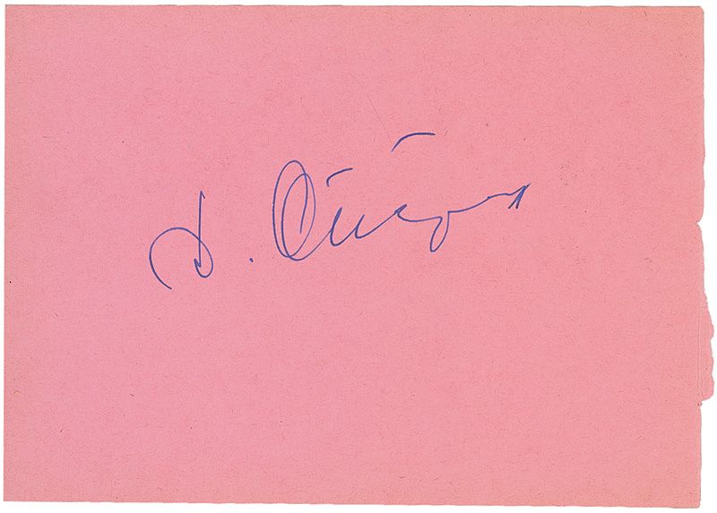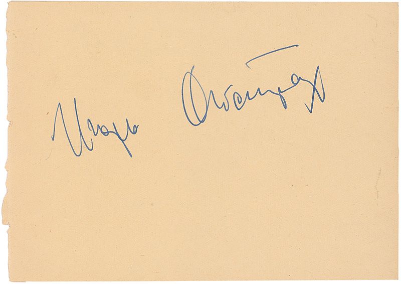 Russian violin virtuoso (1908–1974) and his son Igor (b. 1931), a classical violinist. Two vintage ink signatures, “D. Oistrakh” on a pink 6 x 4 album page and “Igor Oistrakh” on an off-white 6 x 4 album page. In fine condition.