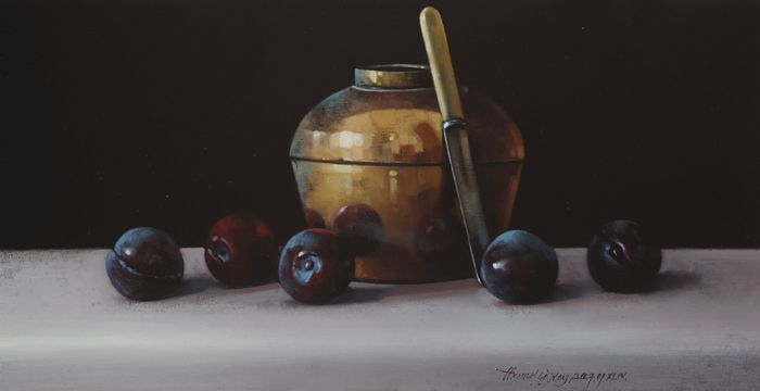 David ffrench le Roy (b.1971) - STILL LIFE WITH PLUMS, KNIFE AND COPPER JAR