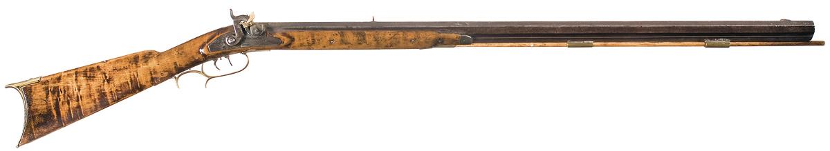 Condition: Very good. The rifle has mottled dark gray patina with minor flash pitting. The brass has a fine aged patina, with a piece of brass missing from the lower buttplate tang. Two large chips of wood are missing from the forearm with a few small chips absent overall, otherwise the refinished stock is very good with a few mild handling marks. Action needs work as the hammer does not hold at the full cock position. A very attractive, no speculation mid-19th century American Blaine rifle.