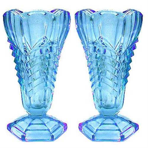 Produced by Davidson Glass during the 1930s and known as CHEVRON this pair (2) of Art Deco ice blue Depression glass vase features a hexagonal shape with six cut stepped sections or chevrons, a scalloped rim and a stepped and footed base. Thet each measure 6 inches tall x 3 1/4 inches across the rim x 3 inches across its stepped, footed base and are both in excellent condition
