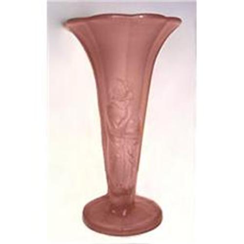 Produced by Davidson, circa 1930, this outstanding Art Deco pink satin glass trumpet vase features, on the front, a beautiful embossed lady wearing a diaphanous Peignoir. Measuring just over 8 inches tall x 4½ inches at its widest point and is in excellent condition.