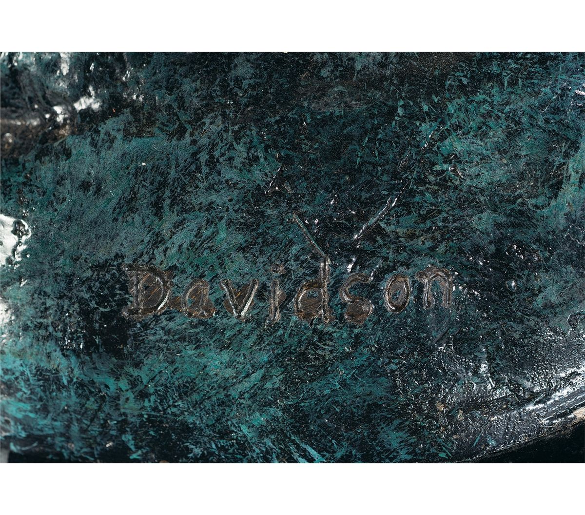 This wonderful polychromed bronze shows 2 Belgian draft horses in full dress regalia with heavy chains for pulling a heavy load. The horses are resting on an upright rocky crag. Signed on the front "Davidson" (Am 20th c). Stands 20 inches tall x 17 inches wide. Mounted on a circular black marble plinth. Weighs 68 pounds.