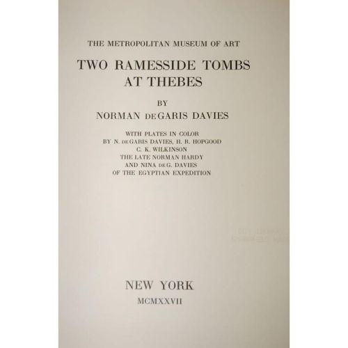 Davies, Norman De Garis. Two Ramesside Tombs at Thebes. Robb De Peyster Tytus Memorial Series - Volume 5 Only. New York: Publications of the Metropolitan Museum of Art Egyptian Expedition, 1927. Elephant Folio - over 15" - 23" tall. Ex-Library. Good Condition. Edited by Albert M. Lythgoe. Of this book 500 copies were printed on Van Gelder handmade paper in the Month of August 1927. xix [1] 86pp [2] 41 (of 42) plates (some folding, some in color) and photogravures, all with tissue guards. Plates have pencil notations on lower edge, not affecting the images. Lacks plate #25. Disbound, in a folding portfolio with ties.