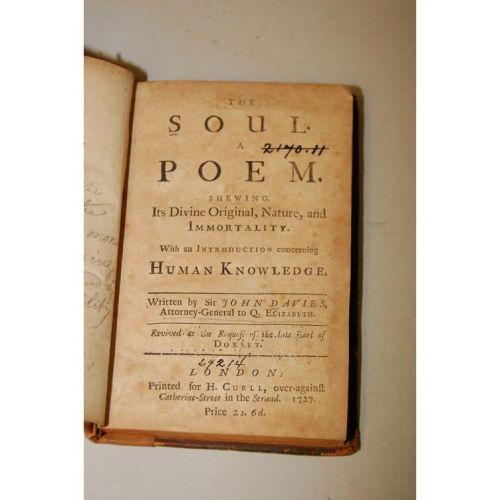 Davies, Sir John [Attorney-General to Q. Elizabeth]. The Soul of a Poem. Shewing, Its Divine Original, Nature, and Immortality. With an Introduction Concerning Human Knowledge. London: Printed for H. Curll, 1727. 16mo - over 5¾" - 6¾" tall. Hard Cover. Ex-Library. Good Condition. Dedication by N. Tate, the Poet Laureate. HANDWRITTEN COMMENTARY on ffp by G. Ellis, Poet. Title [1] 9 Dedication [1] 11 Preface [1] 8pp Author's Dedication, 4 Contents, 131pp. Leather bound, with raised bands on spine, gilt highlighted floral cloth endpapers. Hinges starting, binding tight, light foxing, covers rubbed with edge/corner wear.