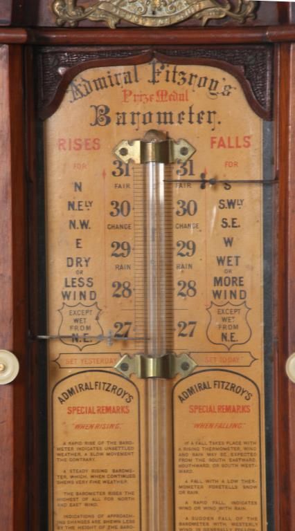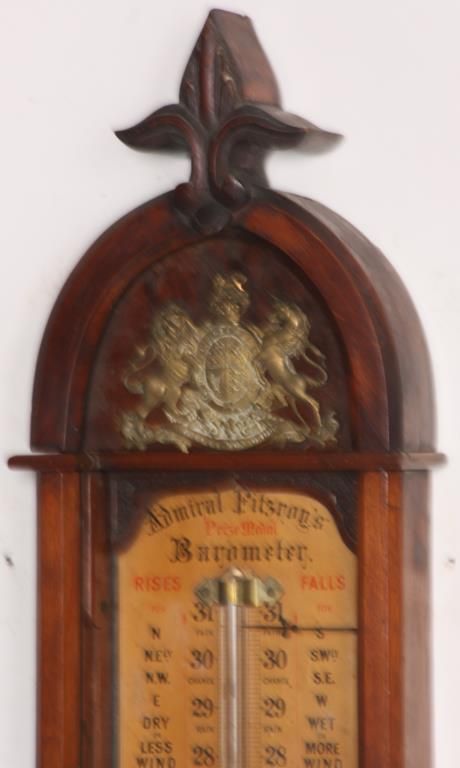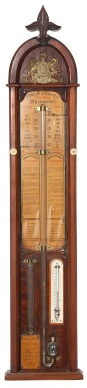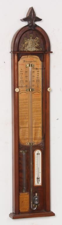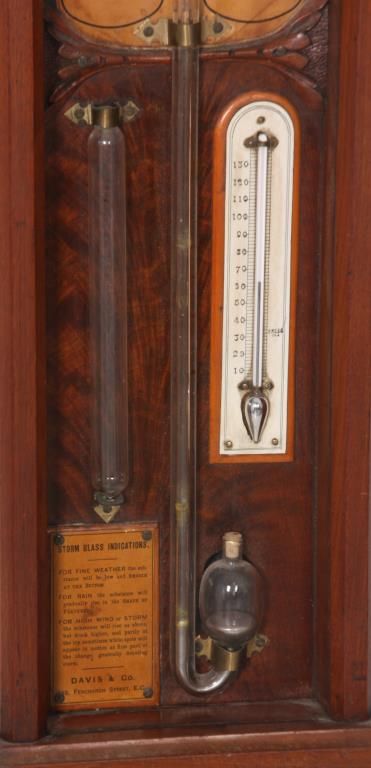 Davis & Co. Hanging Barometer. Long walnut case has a carved crest with a single leaf over an arch with brass repousse shield on the front. Back of the case has an original paper label with “Admiral Fitzroy’s Barometer indications, with long mercury stick barometer in the center, thermometer to the right and signature tag for Davis & Co., 153 Fenchurch Street, E.C. Crest has a split and repair, case is in original finish and labels are in good condition. 46.5 in. long.