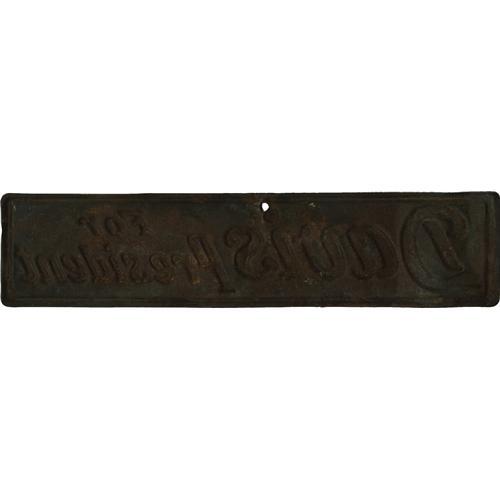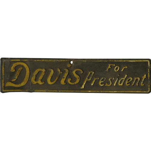 <B>"Davis For President" License Plate Attachment,</B></I> 12" x 3", 1924. Campaign items for Democratic presidential hopeful John W. Davis are always tough to find. This very early ancestor of the modern bumper sticker is no exception. Even light rusting overall with moderate paint loss. Still an attractive and presentable piece of political history. Davis, a conservative Democrat from West Virginia, was soundly beaten by his Republican opponent, Calvin Coolidge.<BR><BR><b>Shipping:</b> Small Collectibles (<a target="_blank" href="http://www.heritageauctions.com/common/shipping.php">view shipping information</a>)