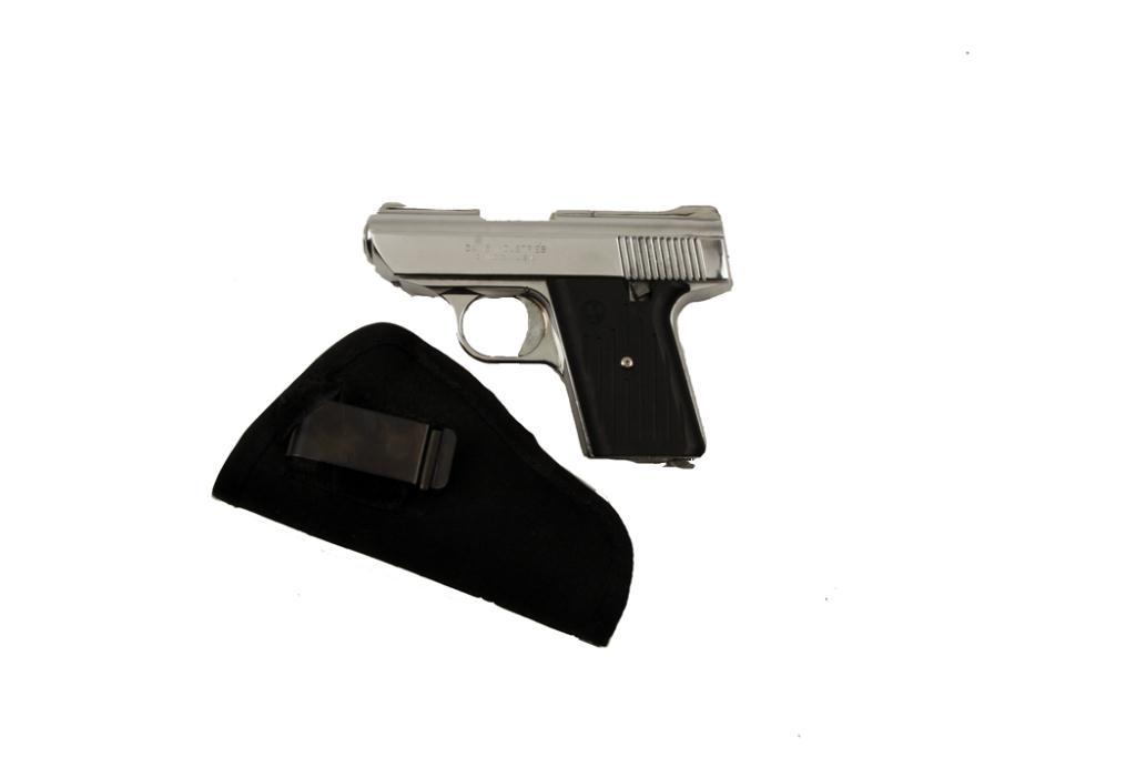 Davis Mdl P380 CAL .380auto SN:AP116852 Nice single action semi-auto pocket pistol with canvas belt clip holster. Nickel finish, black checkered grips, 3" barrel, good bore and action. Condition: Very good with a few minor surface scratches. HolsterNice single action semi-auto pocket pistol with canvas belt clip holster. Nickel finish, black checkered grips, 3" barrel, good bore and action. Condition: Very good with a few minor surface scratches. Holster in excellent condition.