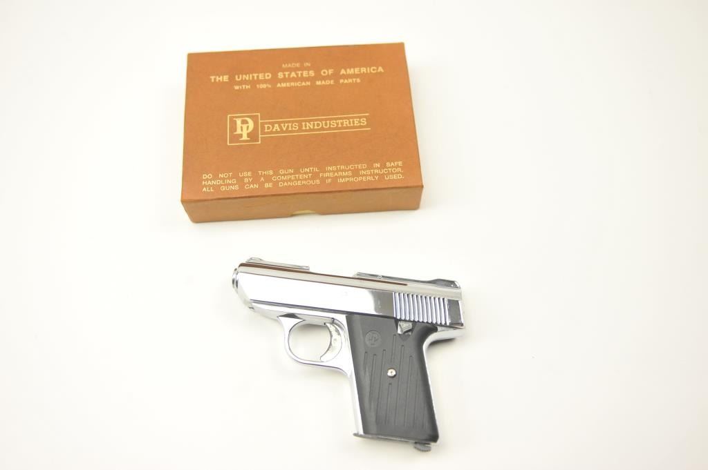 Davis P-380 semi-automatic pistol, .380 ACP caliber, Serial #AP154190. The pistol is in nearly excellent condition in the factory cardboard box with matching end label. The pistol shows most of the nickel finish withsmall mars and scratches. The textured plastic grips are in very good condition. The bore is good and the action functions. The lot includes one correct magazine. Est.: $75-$150. (Modern/PPT).