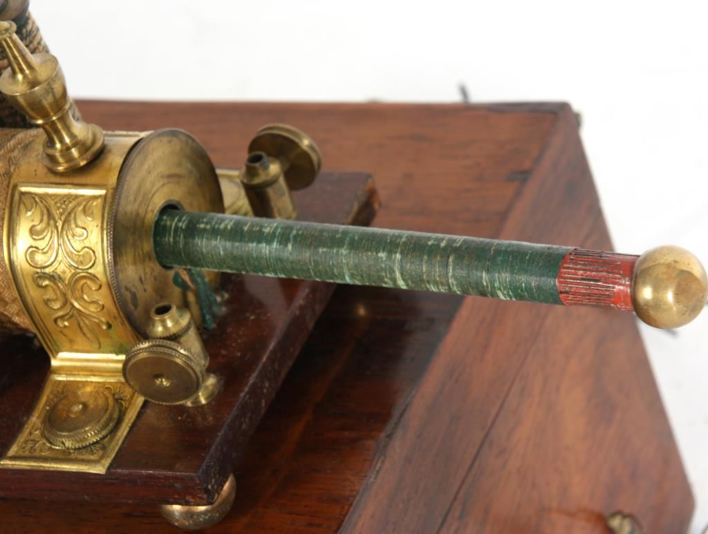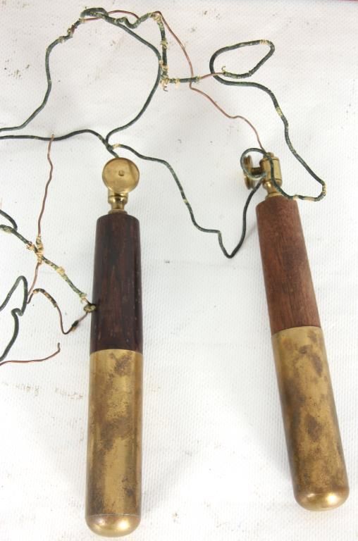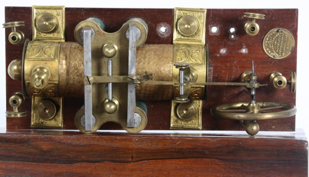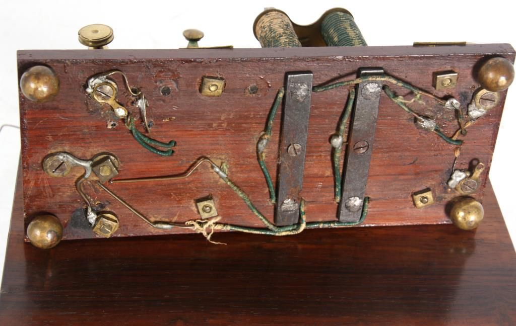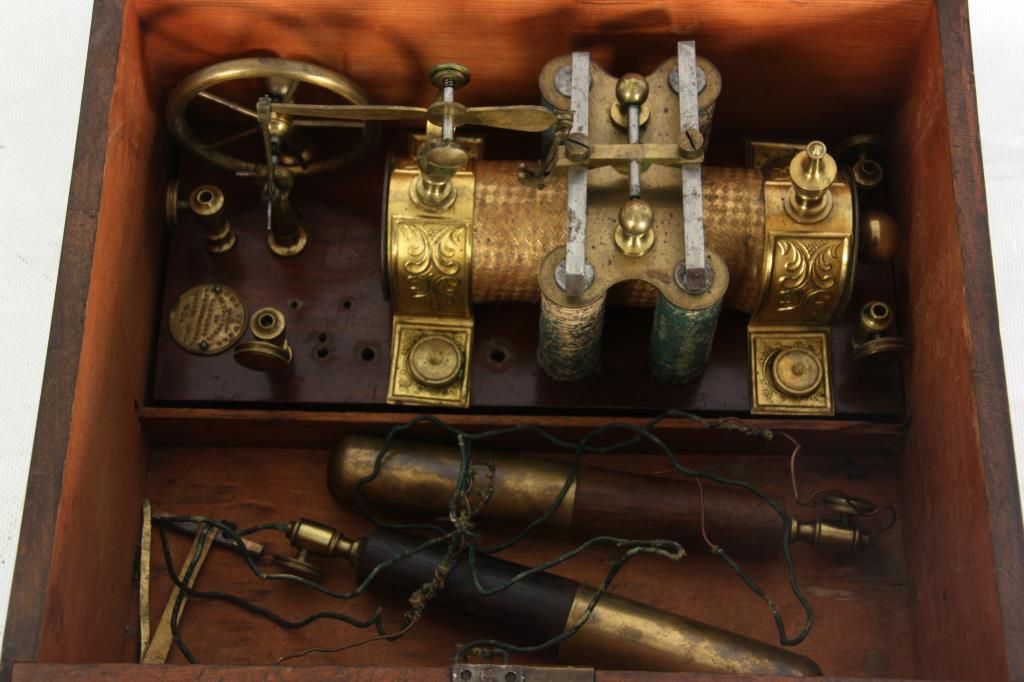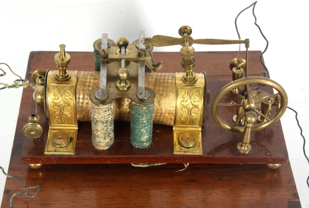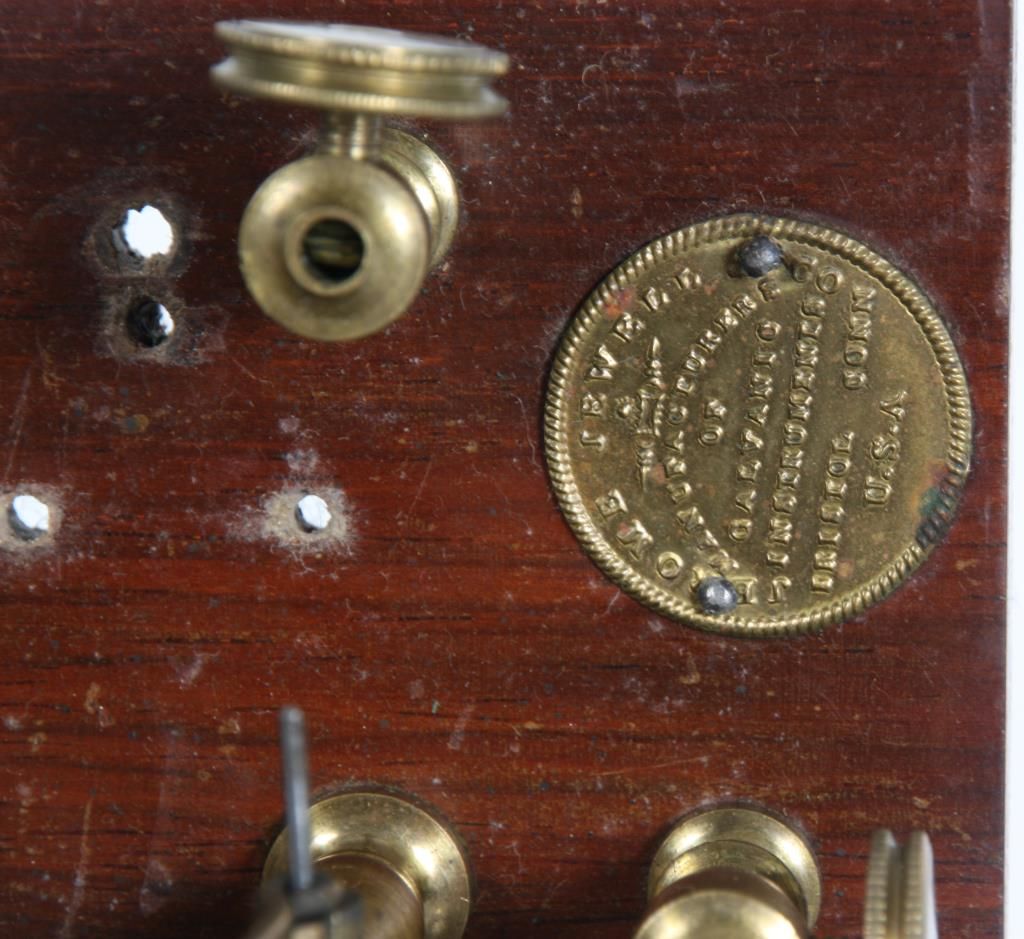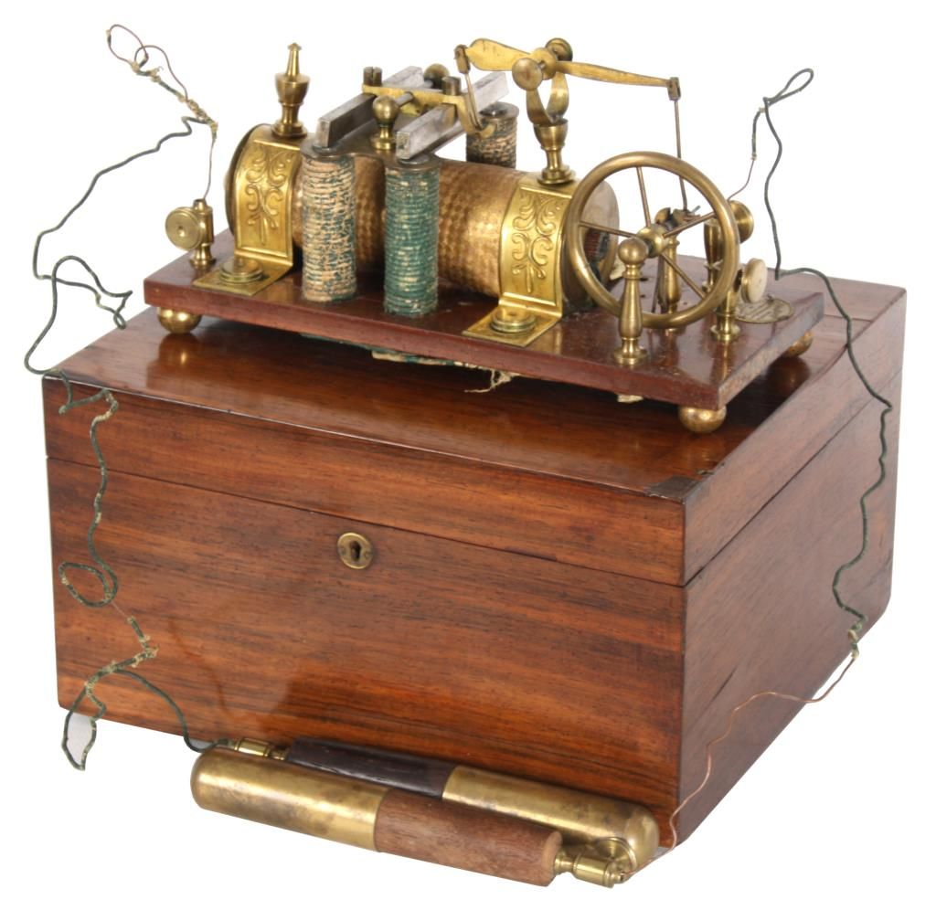 Davis Pattern Medical Coil Electrical Generating Galvanic Action Machine. Mid 19th century machine has a bottle cell battery strapped with brass to a wood base with 4 copper wire wrapped bundles on the sides alternation connection through 2 steel bars at the top driven by a lever mechanism connected to the fly wheel; has brass contact point with screws wired to the rosewood and walnut teardrop shaped positive and negative rods, capped at the ends with brass. The rosewood base has 4 spherical brass feet and a stamped metal tag which reads “Jerome Jewell & Co. , Manufacturers of Galvanic Instruments, Bristol, Con”. In an original rosewood veneered case with lock. Case measures 6 in. high x 11 in. wide x 9.5 in. deep.