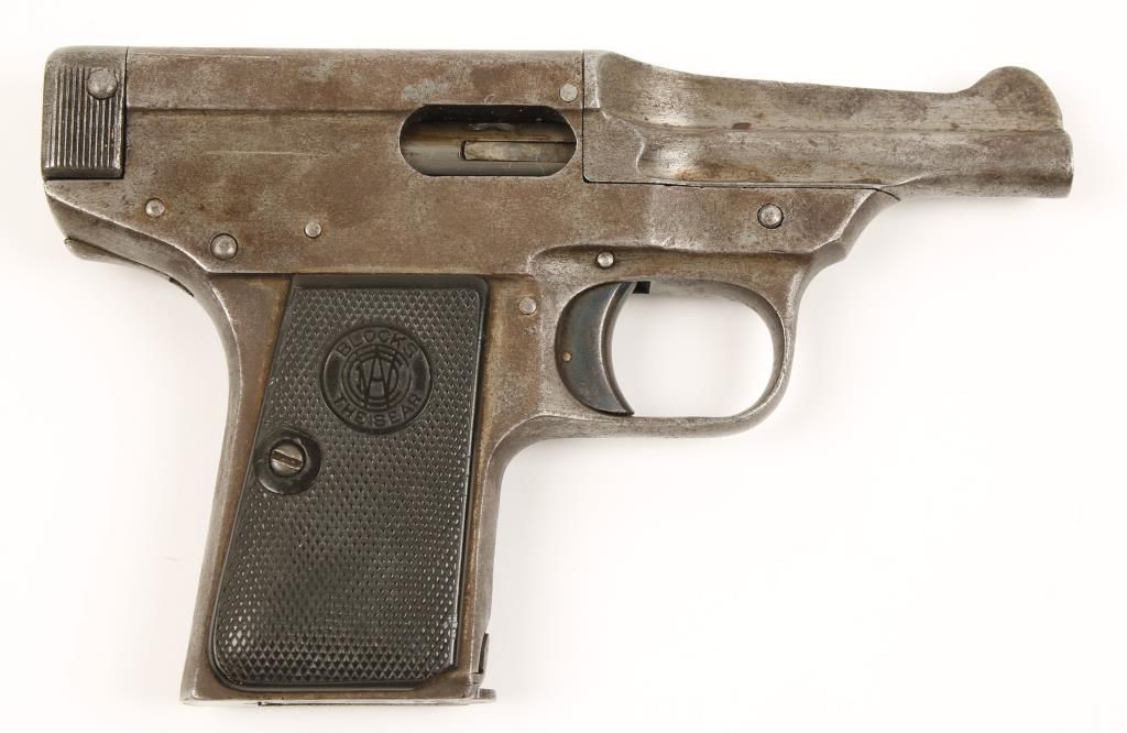 Early single action semi auto pistol with 3-1/4" barrel. Originally blued finish, checkered black plastic grips, and fixed sights. Fair bore and action is not working properly. Includes 1 magazine without internal parts. Condition: Fair with traces of original bluing remaining and action not working. *Curio & Relic Firearm*