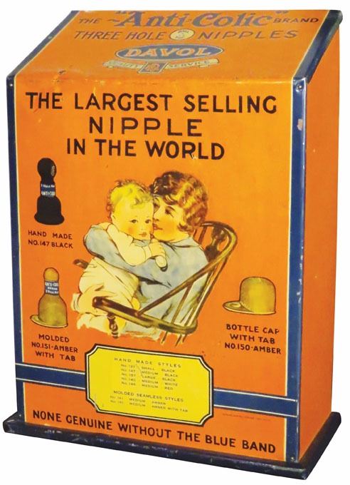 Rare Davol Nipple Tin Litho Display. Small dent at top left and light scratches otherwise good condition. 9 3/4 X 13 1/2 X 5 inches.