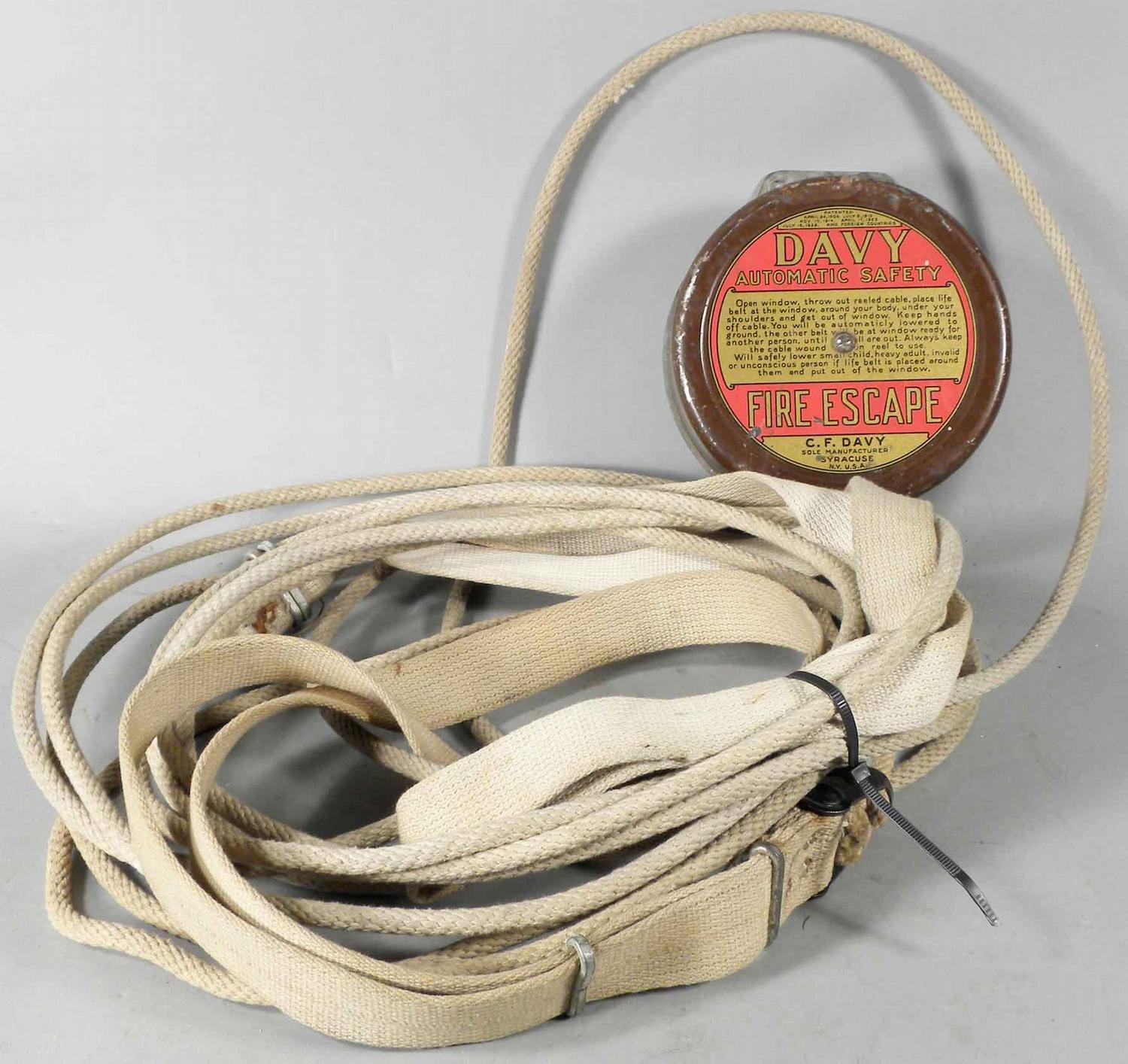 Davy Automatic Safety Fire Escape. Mfg. by C.F. Davy Sole Manufacture Syracuse, NY. USA. Latest patent date April 24, 1906. Very good original condition. Metal reel measures 6 inch diameter.