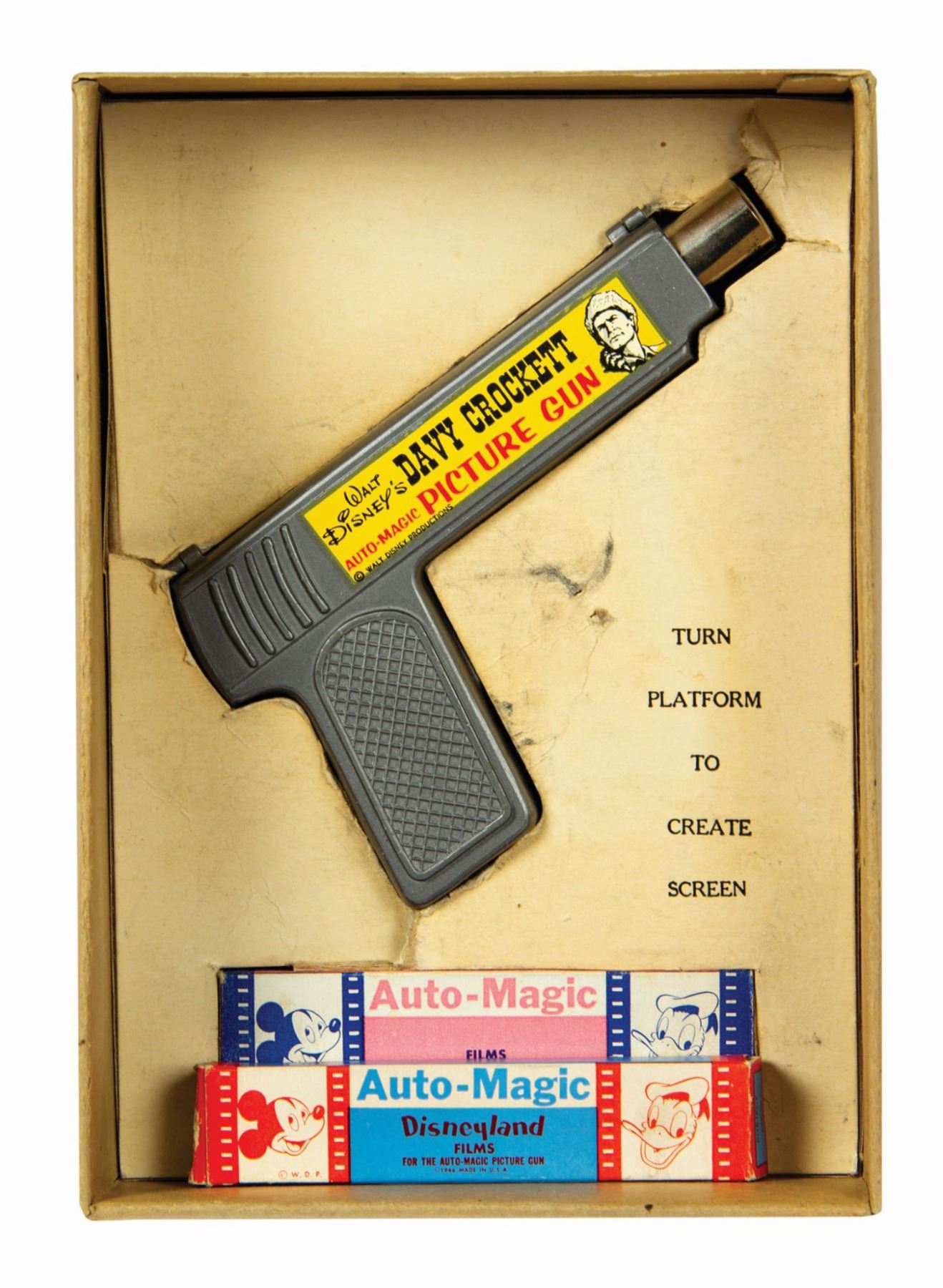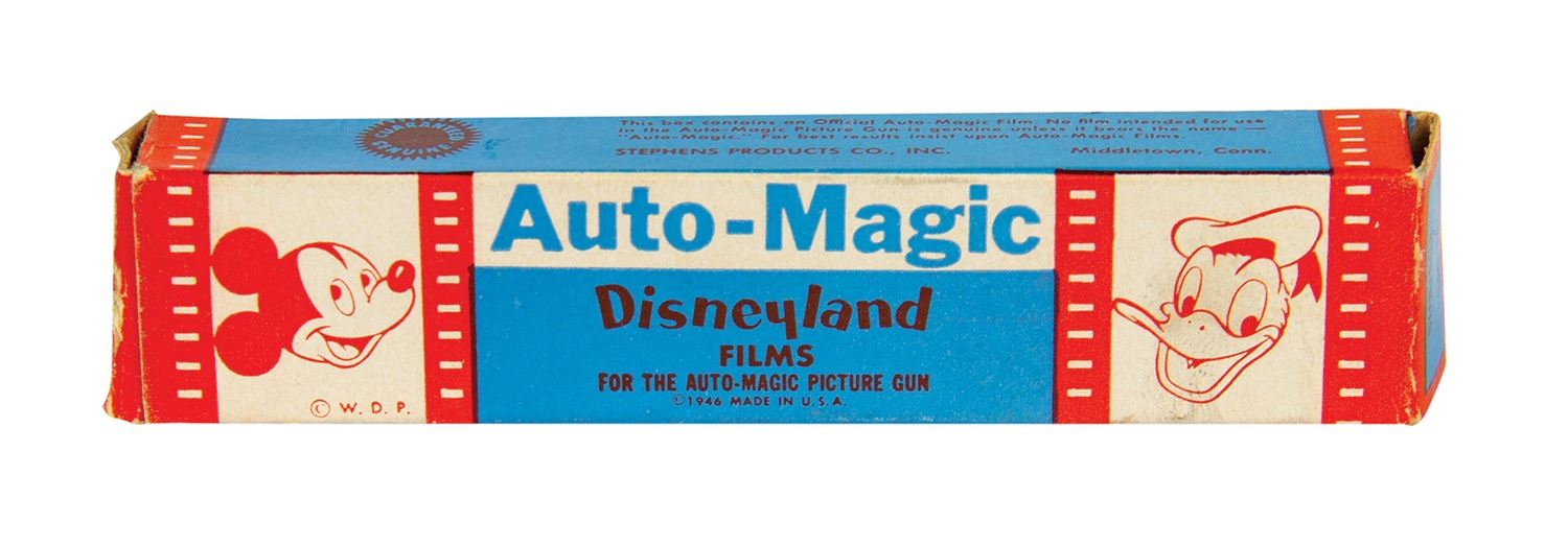 (Disney, c.1950s) A vintage Davy Crockett Auto-Magic Picture Gun single frame projector. Harkening back to a more innocent era, this metal gun-shaped toy opens vertically on hinges to reveal a battery compartment, a track for film strips, a lightbulb to illuminate the frames, and an adjustable magnifying lens “muzzle.” Pressing the trigger advances the film frame and activates the lightbulb. It retains its original Davy Crockett-themed box containing a form fitted cardboard insert for storing the gun and boxes of film. The insert can be removed from the box and flipped over for use as a screen on which to project Picture Gun images and is printed with a blank white field for this purpose. The original instruction manual is present. Also included are (7) film strips: one is installed in the gun and (6) are in two original boxes. The Picture Gun measures 6”x1” and 3.5” tall and is in very good condition. The box measures 6.5”x9.25” and 3” deep. It exhibits some darkening, soiling, a 1”x1.75” patch of surface loss to the lid, tearing to insert, and general wear. The Picture Gun has been tested and is fully functional.