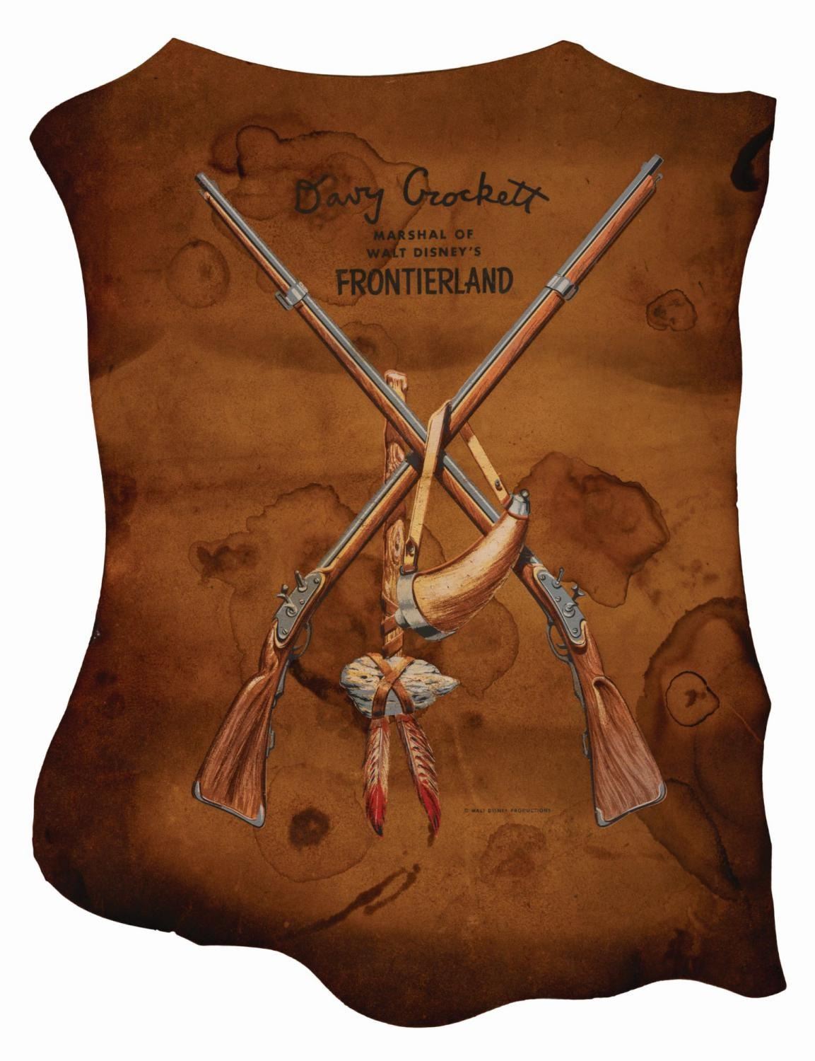 (Disneyland, c.1950s) A hand-silkscreened leather sign promoting licensed merchandise featuring the "Marshal of Frontierland," Davy Crockett. The reverse explains that this sign is only to be used for the purpose of merchandising official Davy Crockett (Fess Parker) designs and products. Measuring approximately 34"x25", the sign is in fair condition with staining throughout and surface wear.
