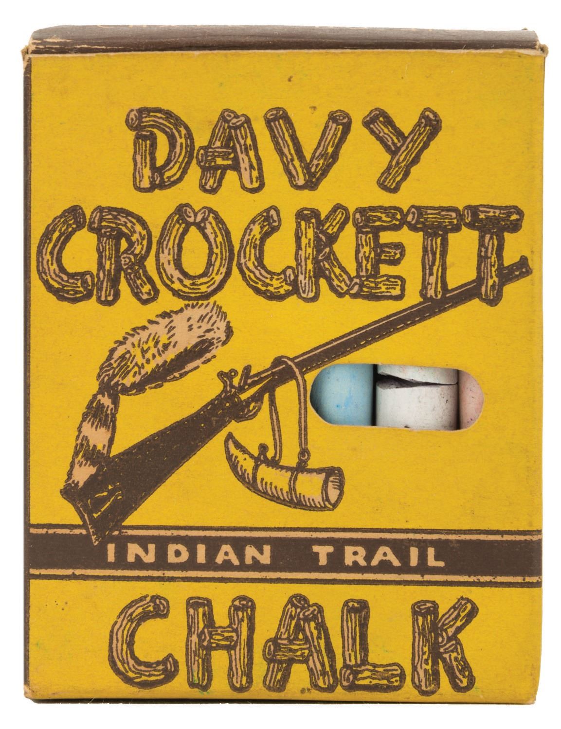 (Creston, 1955) A Davy Crockett Indian Trail Chalk Set & Box by Creston Crayon Company. The box contains twelves sticks of chalk and "Indian Sign" mark instructions on reverse of box. Measuring 3.5"x2.75"x1", the box and chalk are in very good condition, despite nine broken pieces of chalk, and detached flap, scuffs, and wear to box.