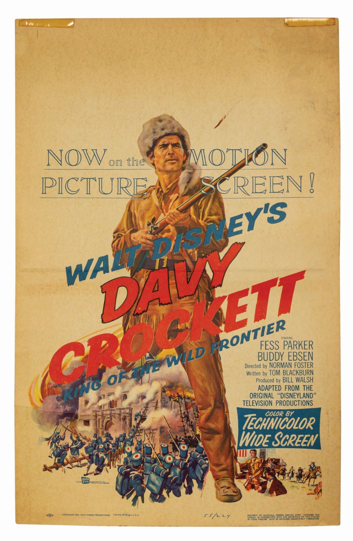 (Disney, 1955) A window card for the feature film Davy Crockett, King of the Wild Frontier. This Fess Parker classic compiled the first three episodes of the television program into a stand-alone feature. Measuring 22"x14", the card is in fair condition with some edge-wear, a few creases, and some yellowing from age. Both upper corners have tape, likely from prior display.