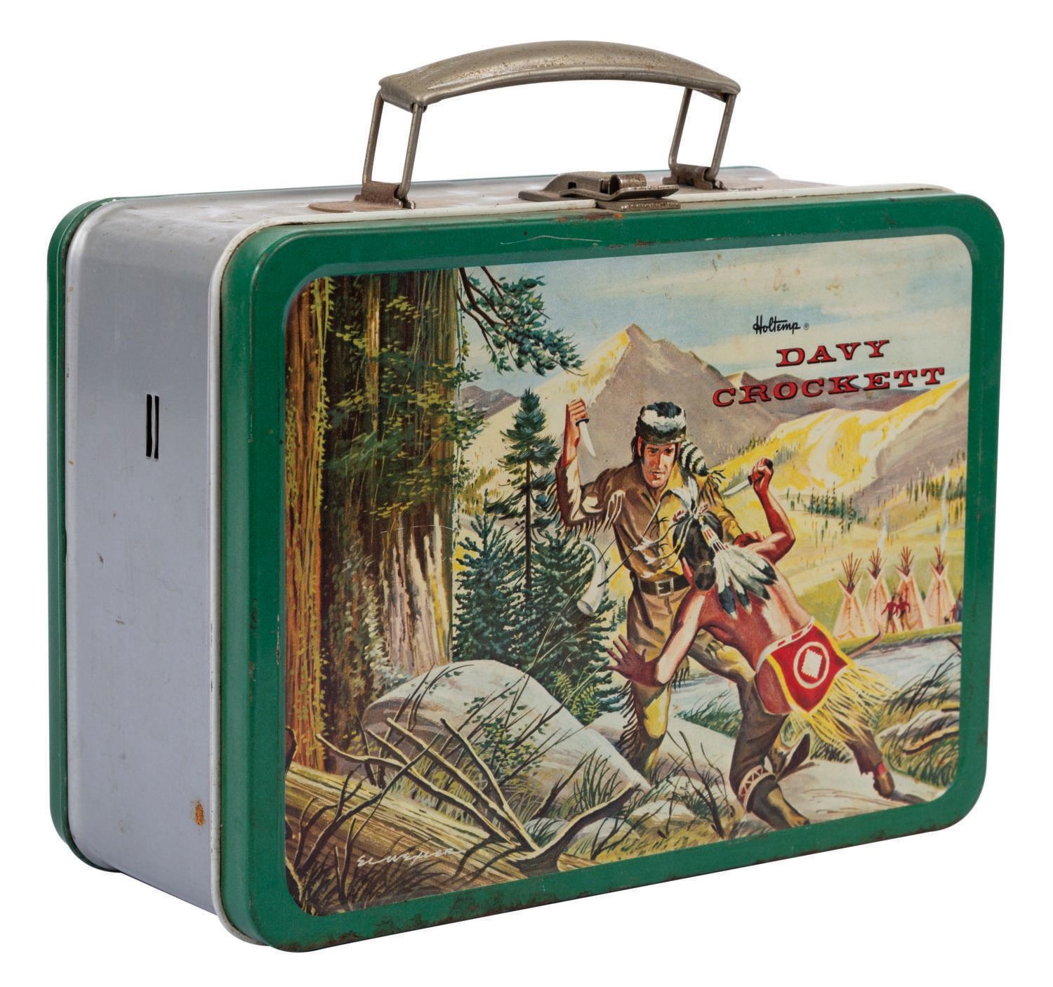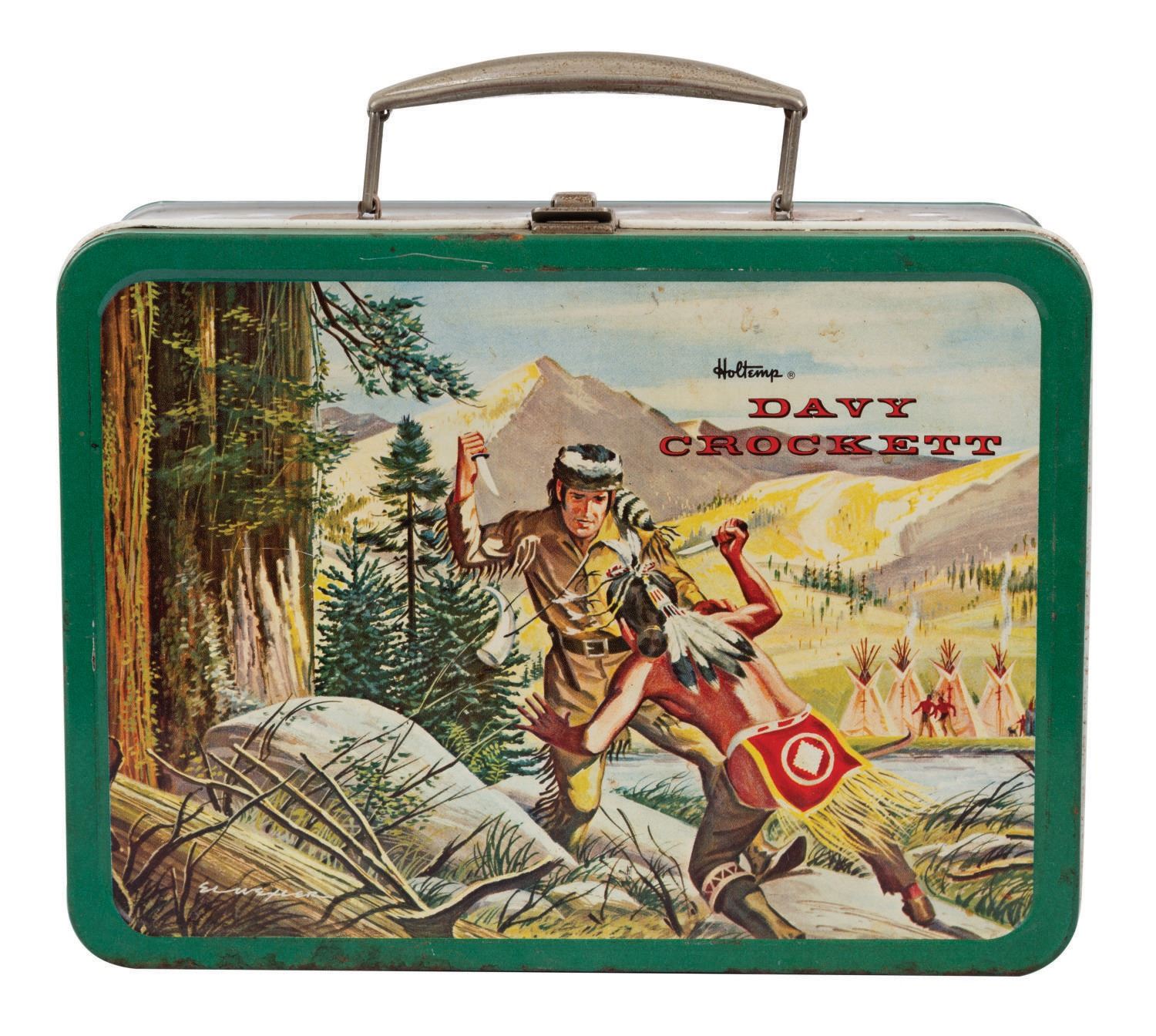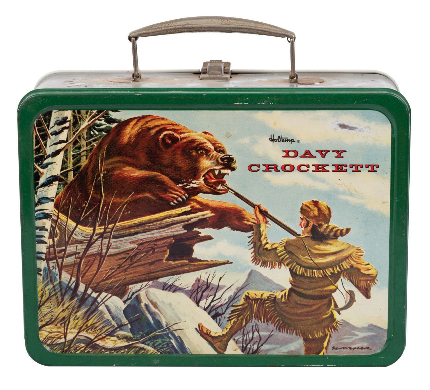 (Holtemp, 1955) A Davy Crockett Lunchbox produced by Holtemp in 1955. Measuring 6"x8.5"x3.75" deep, the metal lunchbox has a front panel painting of Davy and an Indian fighting each other with knives while the back panel has him with a long rifle facing a charging bear. The box is in good condition with light oxidation, and wear overall, particularly to edges. The Thermos is not included.