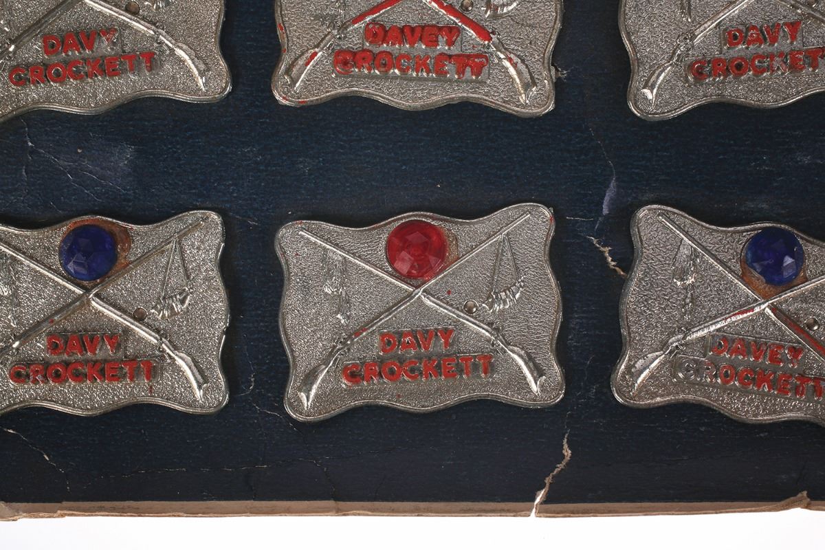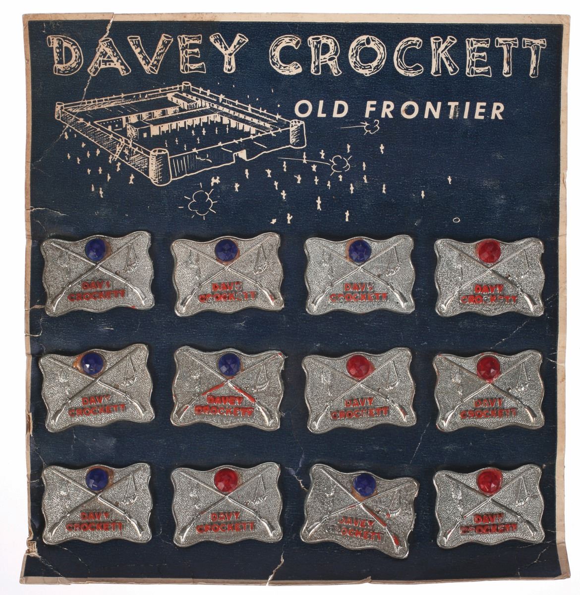 (1950s) Excellent display of metal Davy Crockett pins with plastic rhinestones. The entire display measures 10"x11". In very good condition overall.